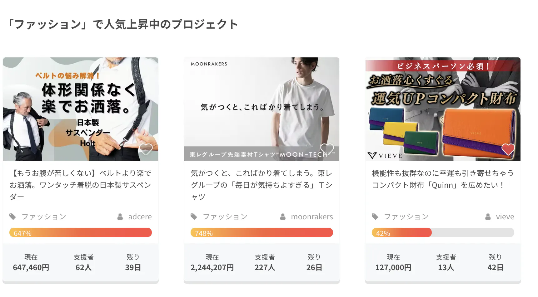 なんとファッションカテゴリーで人気上昇中のプロジェクトとして表示されるようになりました。東レさんの横に表示されるとちょっとうれしいですね。