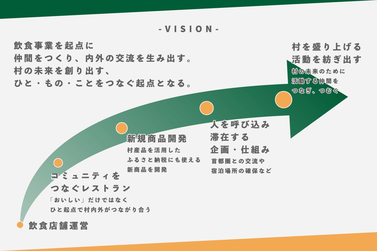 飲食店舗の責任者として地元の方や観光客の方を受け入れながら、食を軸に村の魅力を高めていく莉央ちゃんと、行政職員としての経験やこれまで築いてきた多様な縁を活かして、村の外から多角的な仕組みづくりに取り組んでいく自分。それぞれのスキルをもって新たな ひと・もの・こと の流れを生み出していきたいと考えています。