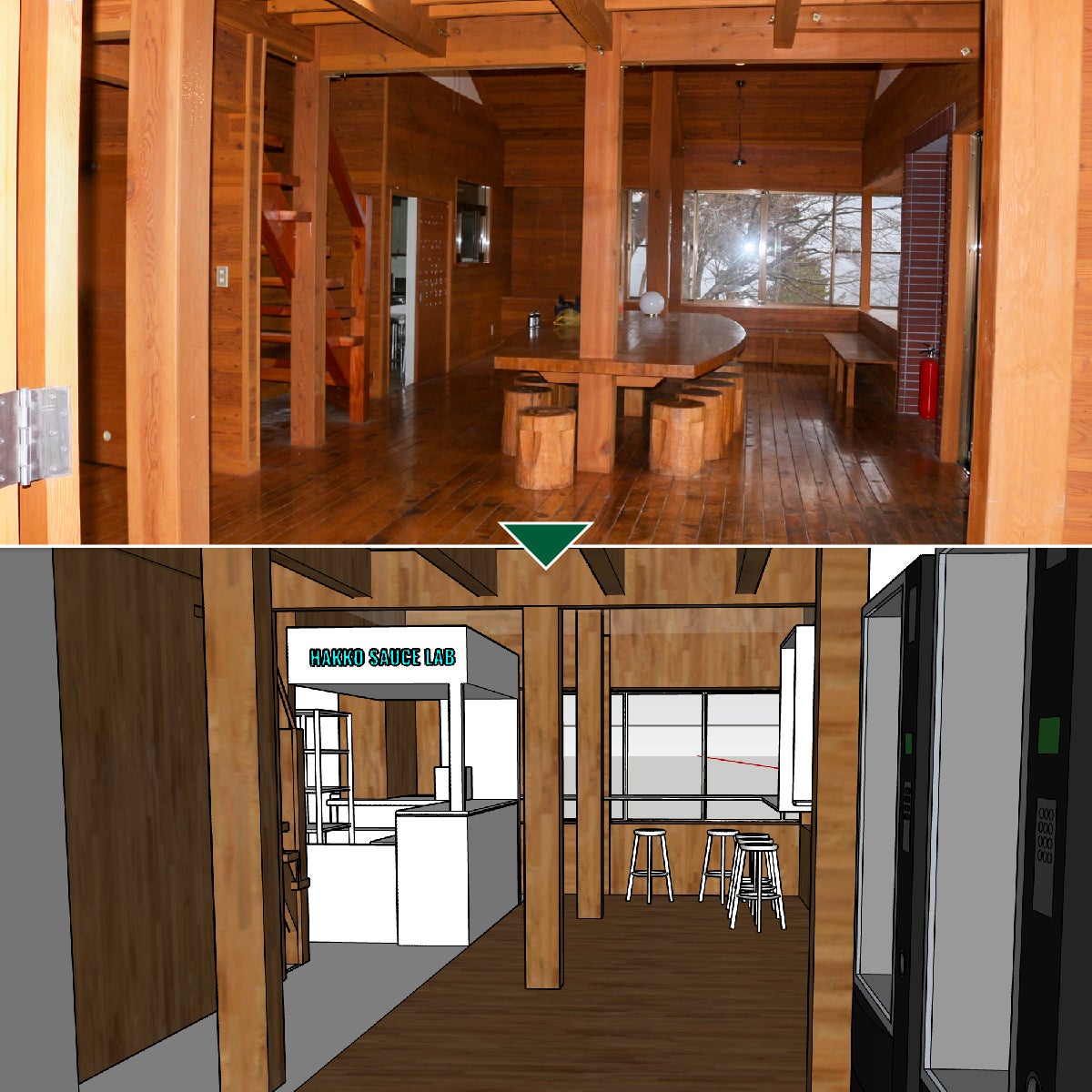 店内改装イメージ。HAKKO OOSHIKAのサブタイトル『Sauce Labo』にちなんで、ログハウス調の屋内に研究施設のようなアクセントを加えます