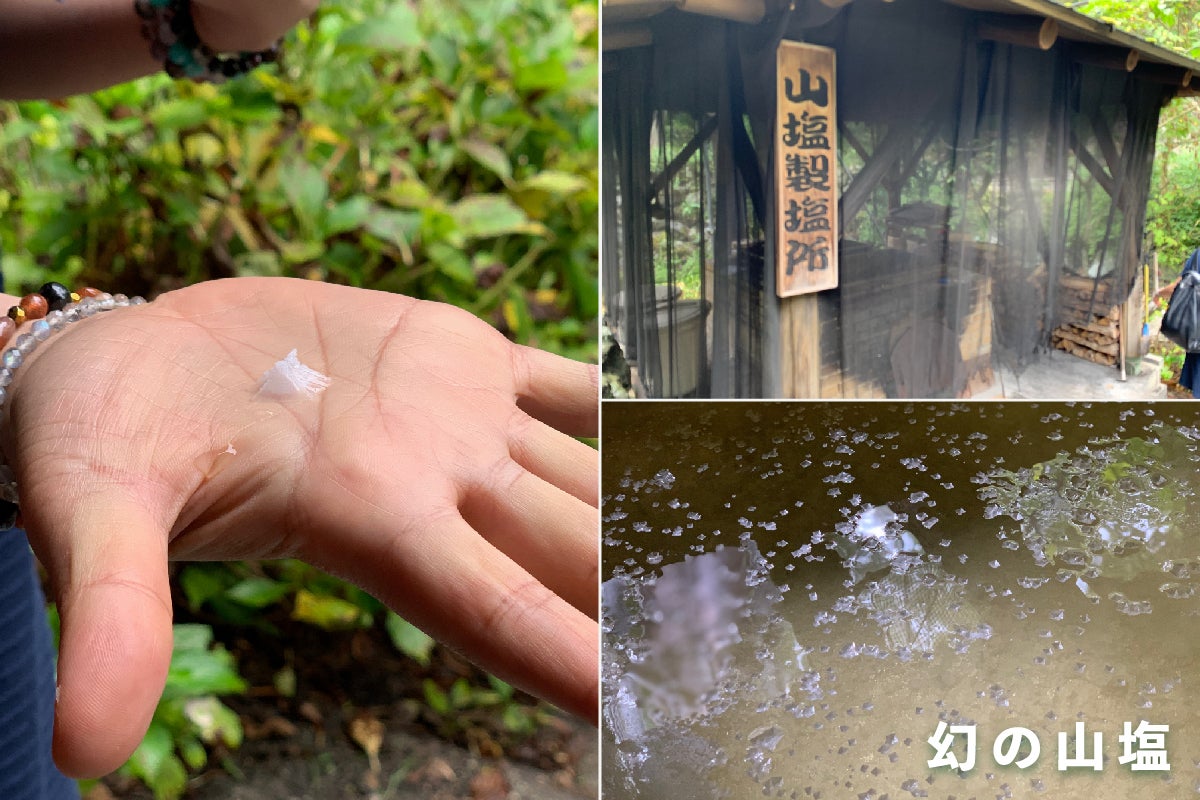 この塩水を一日半ゆっくり煮詰めたあと、天日干しすることで、村特産の山塩が誕生します。でも、100リットルの塩水から作れる山塩はたった30グラム。まさに幻の塩なんです。海の塩特有のにがりが少なくて、ほのかに甘みがあるのが特徴です。