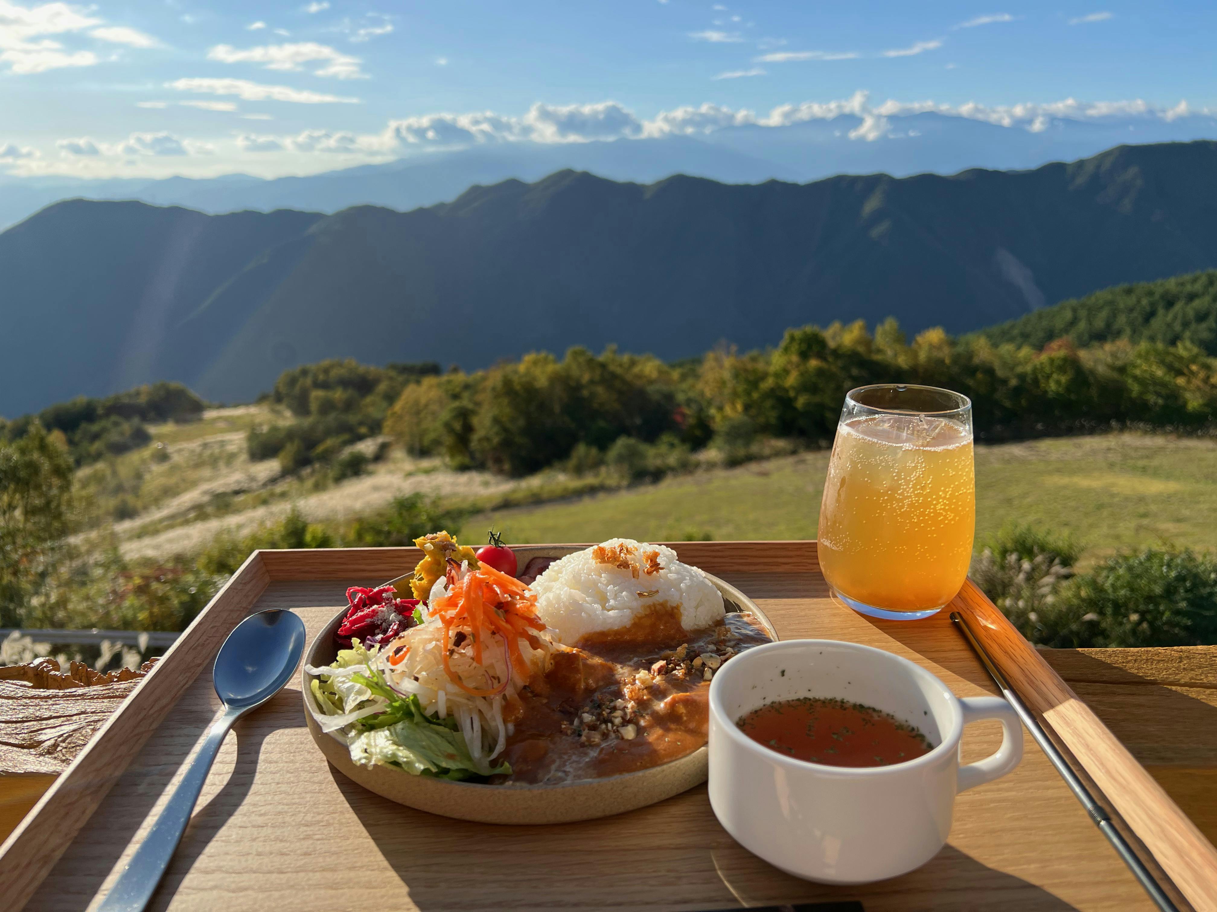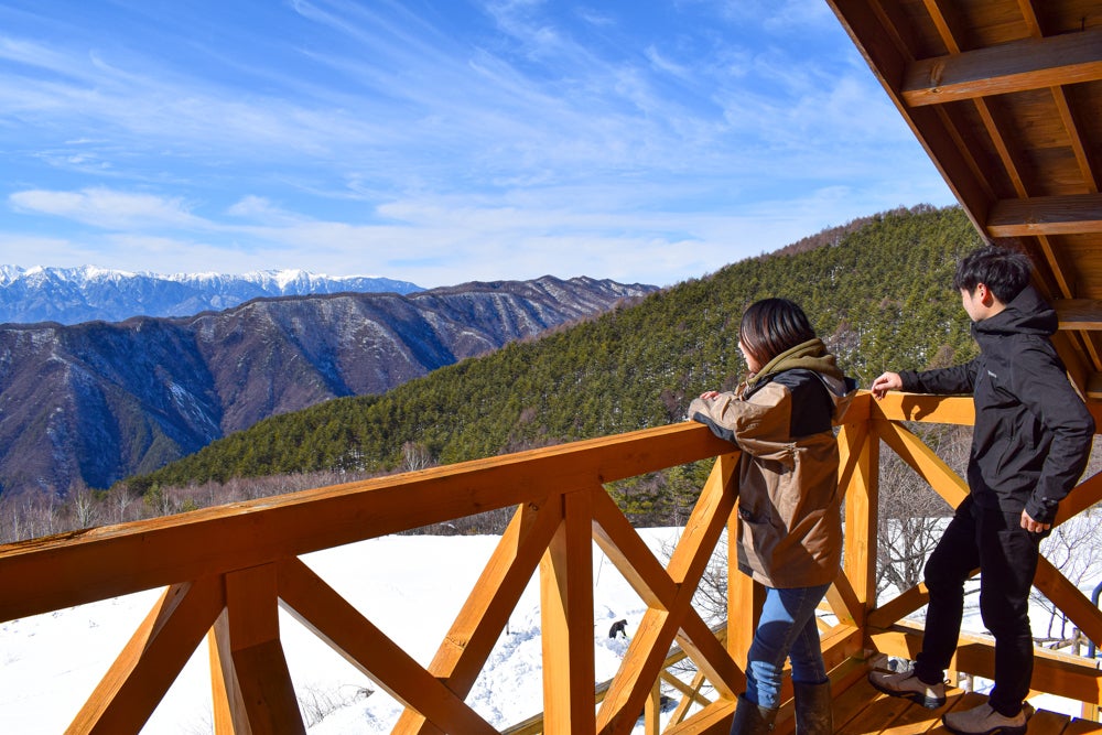 突然ですが、私たちがこのテラスから眺めている景色がこちら!中央アルプスの絶景が望める標高1500mの大自然のなかに、村に訪れるきっかけとなるようなレストランをオープンします。