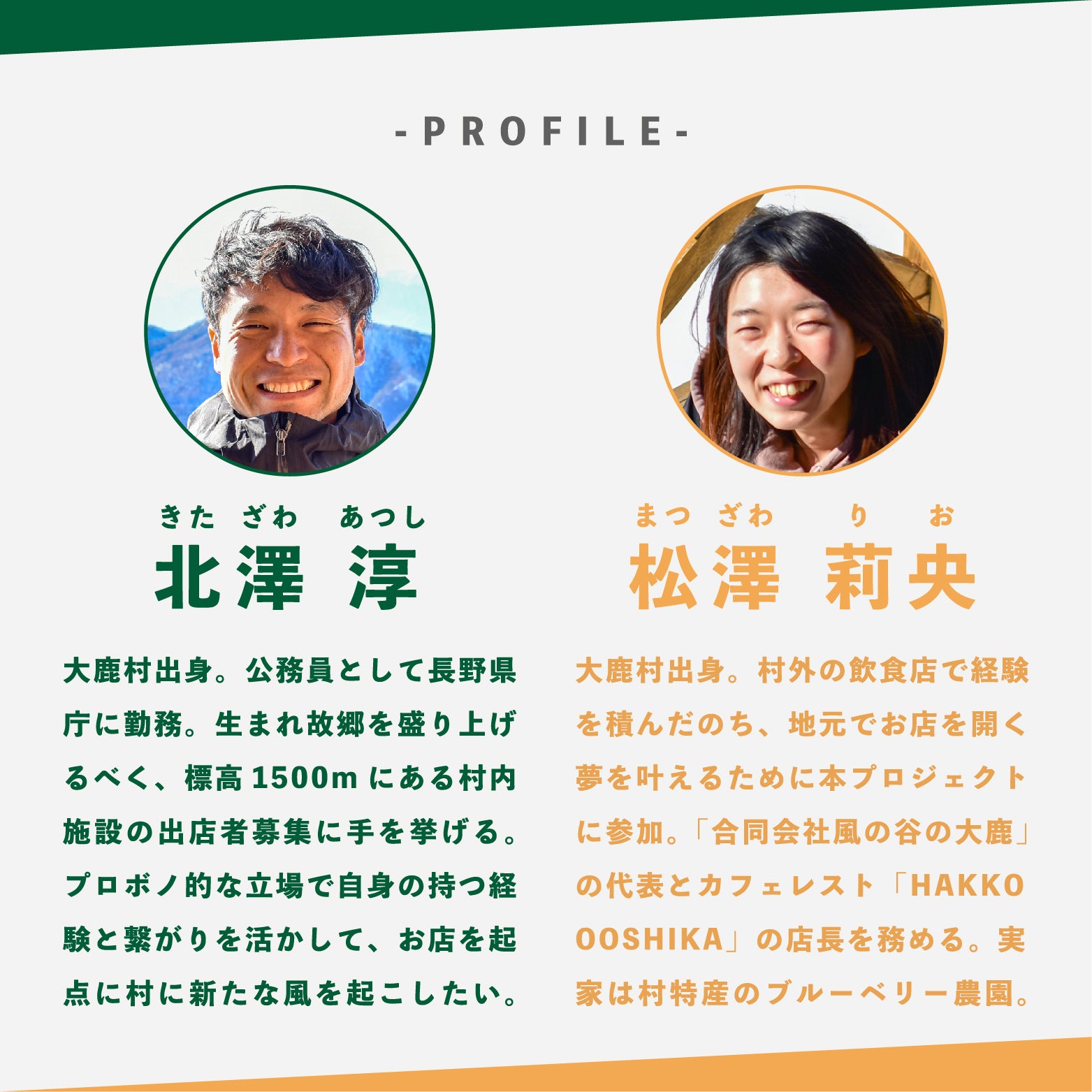 ページをご覧いただきありがとうございます!北澤淳(きたざわあつし)と松澤莉央(まつざわりお)と申します。私たちは生まれ育った故郷・大鹿村に新たな風を興すため『合同会社風の谷の大鹿』を設立しました。人口1000人以下、深刻な高齢化が進むこの村独自の文化と暮らしを未来へつなぐため、村の内と外から活動していきます。