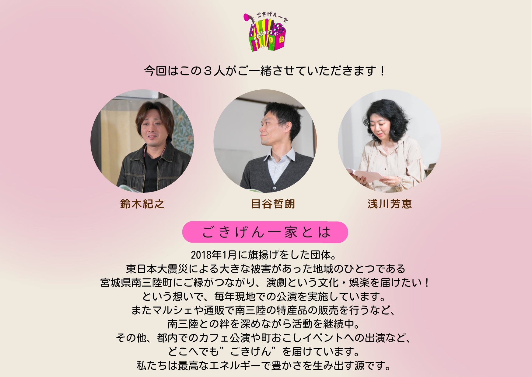 ■ごきげん一家とは 2018年1月に旗揚げをした団体。 東日本大震災による大きな被害があった地域のひとつである 宮城県南三陸町にご縁がつながり、演劇という文化・娯楽を届けたい! という想いで、毎年現地での公演を実施しています。 またマルシェや通販で南三陸の特産品の販売を行うなど、 南三陸との絆を深めながら活動を継続中。 その他、都内でのカフェ公演や町おこしイベントへの出演など、 どこへでも”ごきげん”を届けています。 私たちは最高なエネルギーで豊かさを生み出す源です。