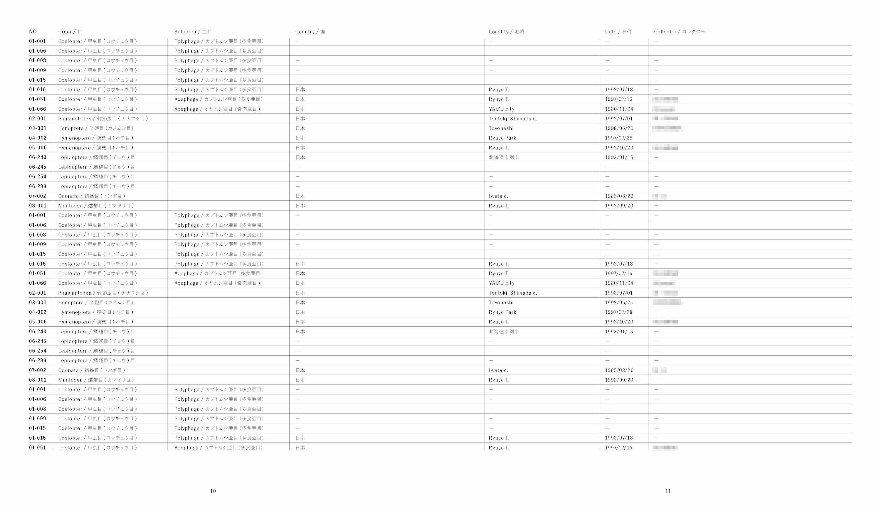 行き場のない昆虫標本を見たときの感情は、これまでの制作での気持ちとは異なるものでした。今回のプロジェクトでは、行き場のない昆虫たちを記録するために標本図鑑を作りたいと考えています。それは、昆虫たちが個別の個体として生きていたことを証明するものです。