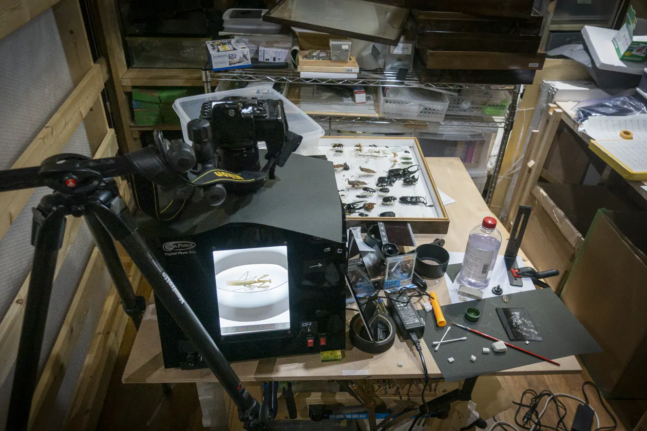 多くのご支援を誠にありがとうございます。現在、毎日撮影を続けております。写真は昆虫標本の撮影風景です。埃が目立つ個体は、テーブル右の黒画用紙の上で筆を使って慎重に取り除き撮影しています。