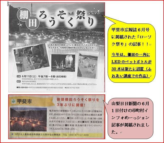 6月11日(土)午後7時に一斉に敷島御領棚田全体に「ローソク」が点灯されます!!夕闇迫る中で、幽玄のローソクの明かり600本がゆらゆらと・・・地元甲斐市広報誌6月号及び山梨日日新聞の6月1日付けでも「ローソク祭り」の記事が掲載されました。今年は、先日の公民館講座「親子ふれあい教室でのLEDペットボタル作り」や同じく公民館講座で大人対象の「LEDペットボタル作り」で製作した受講生名入りのペットボタル約30本も棚田の一角に設置され、ローソクの明かりともに夜空を輝かせてくれます!!また、本日(6月4日)は、この御領棚田で「お田植え祭り」が県立甲府一高主催で開催されました。高等支援学校桃花台学園の太鼓隊の勇壮な和太鼓の響き!! 早乙女姿の女子高校生や親子連れのちびっ子達で、この御領棚田は一日中賑やかでした。お知らせ 上記の「お田植え祭り」に関する投稿記事が、次のアメーバーブログに投稿されております! 是非是非・・・アクセスをお願いいたします!!① 御領棚田応援ブログ(ブログの題名です!) usiku2022のブログ (ameblo.jp) ・・・WEB上で張り付けてください! ② 遊農人のブログ(ブログの題名です!) https://ameblo.jp/ysys00001515/ ・・・WEB上で張り付けてください!