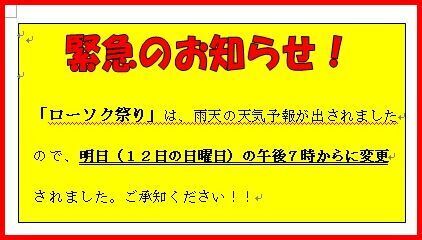 今日開催される予定の「ローソク祭り」は、天気予報が雨との情報で明日の12日(日)午後7時からに急遽変更となりました。 ご理解の程、よろしくお願いいたします。