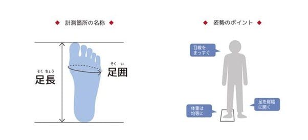 足のサイズを知るためには足長(そくちょう)と足囲(そくい)を計測します。一人では正しい姿勢が保てないので、計測の際は他の方にお願いすることをお勧めします。