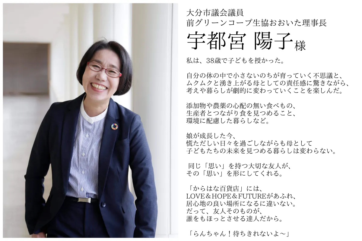 大分県内や九州内など、からはな百貨店から近い小規模生産者さんの生産物を中心に扱い、生産者さんの顔が見えるようなお買い物ができる店を目指します。