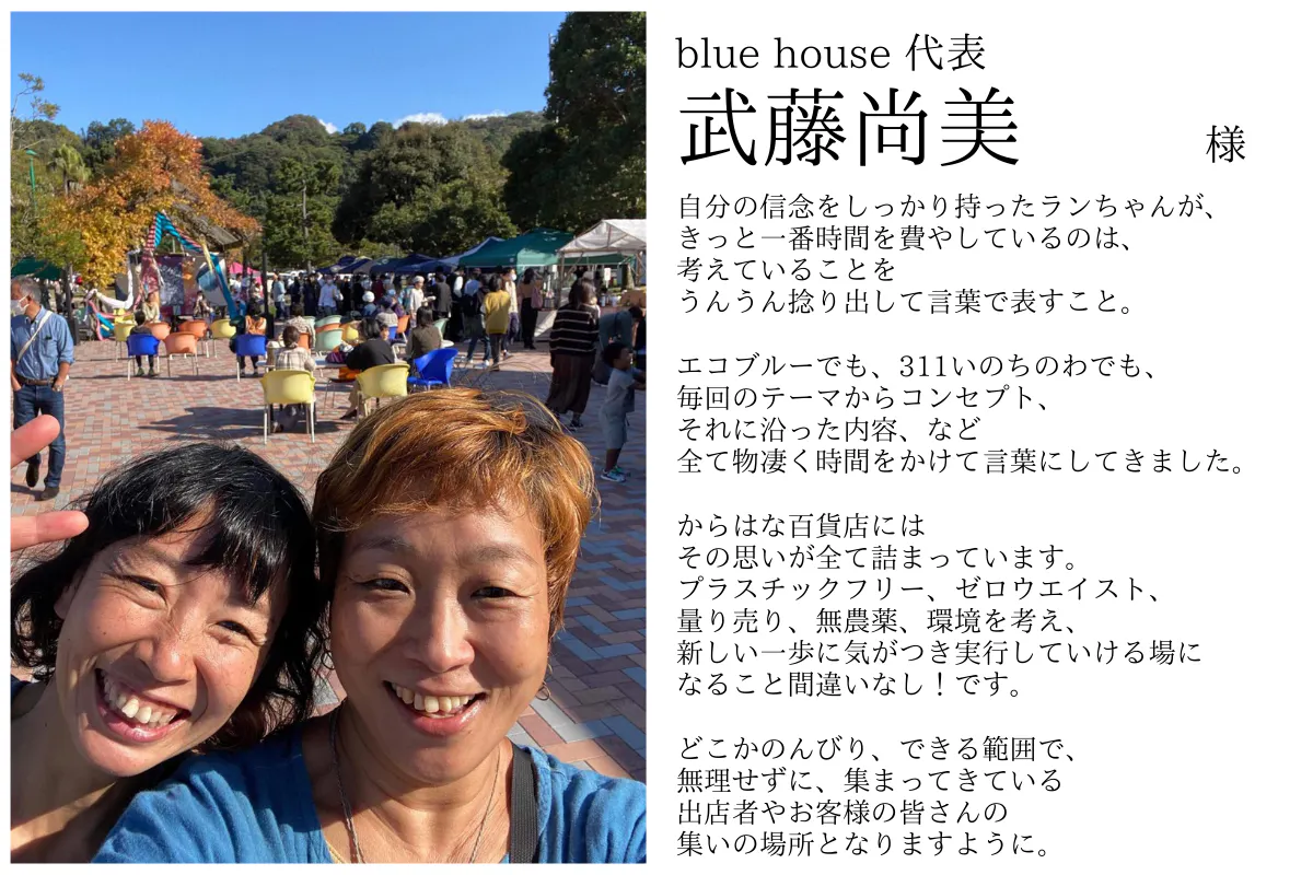 はじめまして。大分県大分市で、イベント「エコブルー 今日はゆっくりecoがいい×blue market(http://www.facebook.com/ecoblueoita/)」(以下「エコブルー」)を主催してきた実行委員会代表の「らん」こと「井藤 優子」と申します。