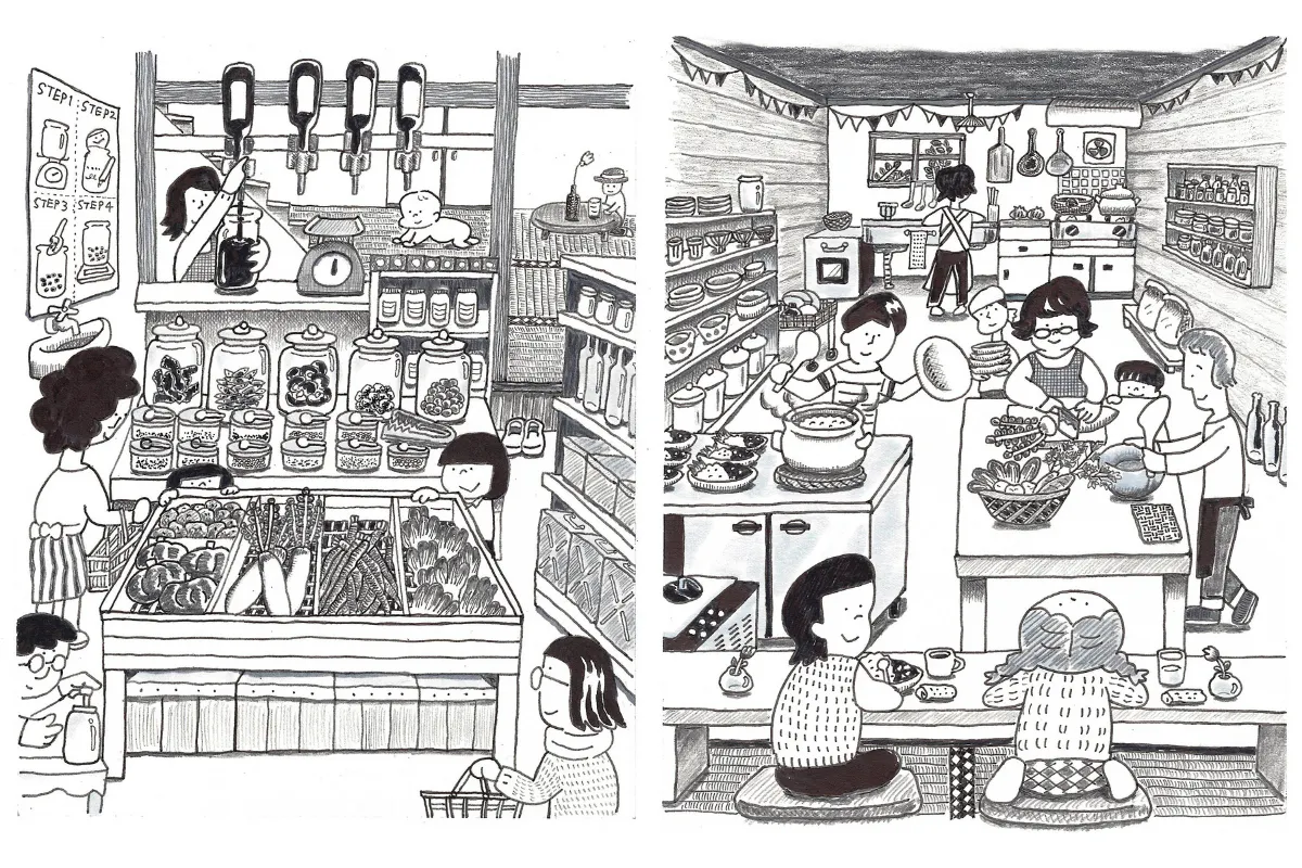 米/雑穀/野菜/小麦粉/米粉/そば粉/天然酵母パン/パスタ/乾燥ショートパスタ/パンケーキミックス/豆類/塩砂糖/味噌/醤油などの調味料/油各種/カレー粉やスパイス各種/コーヒー豆/お茶葉 果物/ナッツ/焼き菓子/おやつ/かつおぶし/昆布/干ししいたけなどの乾物/ココアパウダー/チョコレート/梅干し/納豆/ジャムなど/日々の台所で必要とする食料品