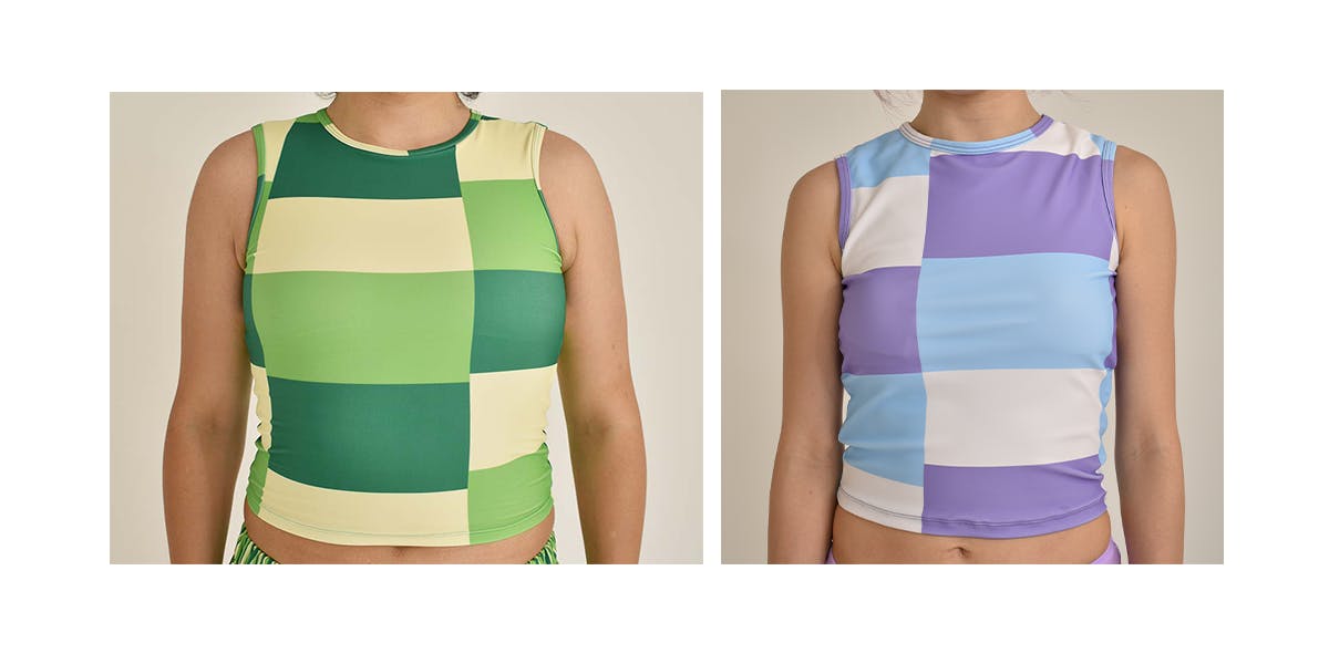 カラフルなブロックチェック柄を採用した、ファッション性の高いタンクトップスイムウェア。