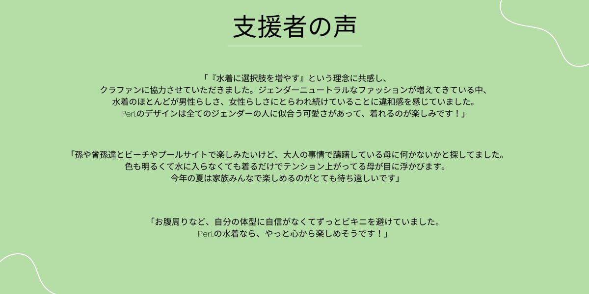 2022/07/26 09:25こんにちは、Peri.です!!CAMPFIRE開始依頼、ブランドのインスタグラムを通して発信してきた内容や頂いた温かい支援の声などをCAMPFIREを見てくださる皆様とも共有したく、CAMPFIRE終了まで残り1週間を迎え、本文に複数箇所追記をいたしました。<<追記箇所>>① 吸水ボトムクロッチ部分の機能構造今回の商品ラインナップにある吸水ボトムには、多くの方に関心と興味を抱いていただいています。ただ、やはり吸水ショーツと違って、吸水水着の場合はどのように機能するのだろうか?吸水とはどういうことなのか?というような疑問の声も多くいただきました。そこで、よりわかりやすい形で吸水構造をご説明できれはと思い、下記情報を追記しました。--------------------------------------------------------------------------------------失禁ショーツなどでも使用されている、吸水力の高い三層構造の特殊な生地を採用。撥水性のある水着表地と肌に優しい水着裏地で挟み込んだ、合計5層構造の吸水スイムボトムを独自開発しました。 ① 水着裏地 ② 吸水速乾加工 ③ 吸水消臭 ④ 透湿フィルム ⑤ 撥水水着表地1層目:水着裏地液体を通過させ、肌に触れる面をサラサラに保ちます。経血の漏れが目立たない、紺色の無地生地を採用。2層目:吸水速乾加工1層目で通過した液体を素早く吸水して漏れをガードしながらも、蒸れを防ぐ速乾加工。3層目:吸水消臭2層目で吸収した水分を保水しながら、強い消臭性で気になるにおいを緩和。4層目:透湿フィルム衣服内の水蒸気や湿気を外に逃がして蒸れを防止。5層目:撥水水着表地水切れがよく、乾きやすい撥水水着生地で外部からの水分を弾きます。② 支援者の声CAMPFIRE開始依頼、支援メッセージ欄やインスタグラムの投稿、コメントなどで多くの方からPeri.の想いに共感頂いております。そのような声をインスタグラムでは個々に紹介していたのですが、CAMPFIREにおいてもまとめて皆さんと共有できればと思い、追記しました。いよいよCAMPFIRE終了まで1週間を切りました…!この機会に、1人でも多くの人に私たちの活動を認知いただき、「誰にとっても優しい社会作り」のためのムーブメントにご賛同いただければとPeri.一同、心より願っております! もっと見る