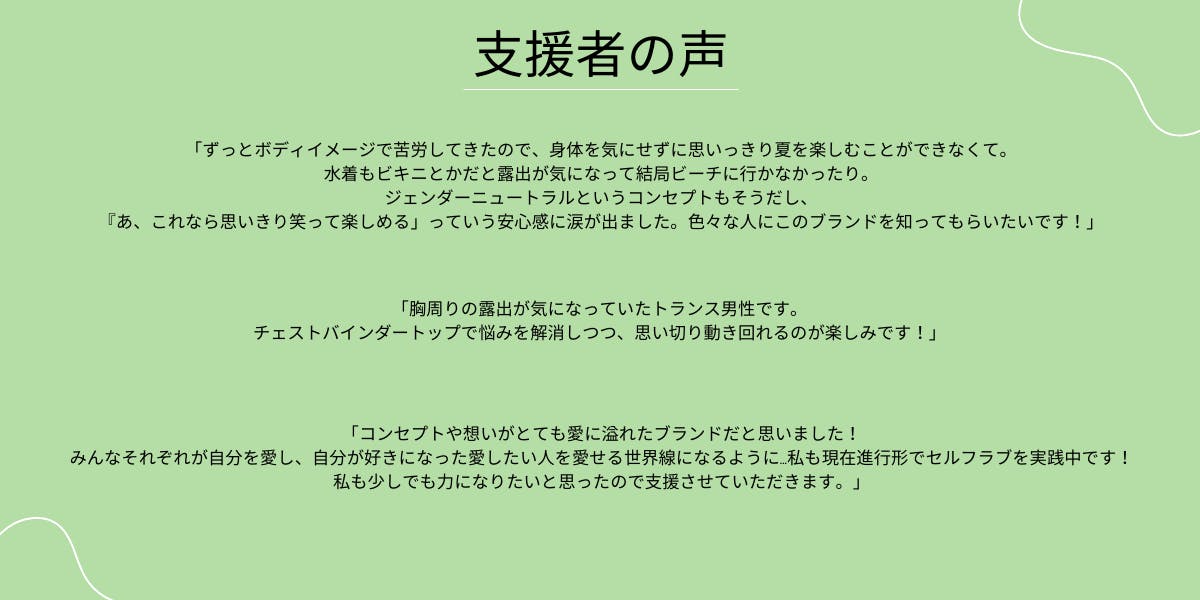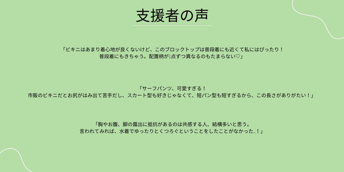 このプロジェクトにご賛同いただき、水着を使ってもらうことが、自分を愛するきっかけになりますように。