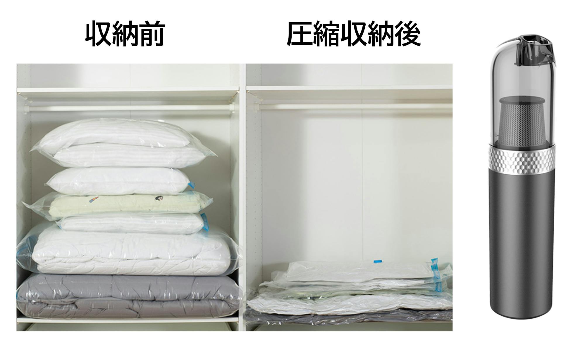 たった8秒で圧縮袋の空気抜きが完了し、収納の効率化と時間の節約ができます。