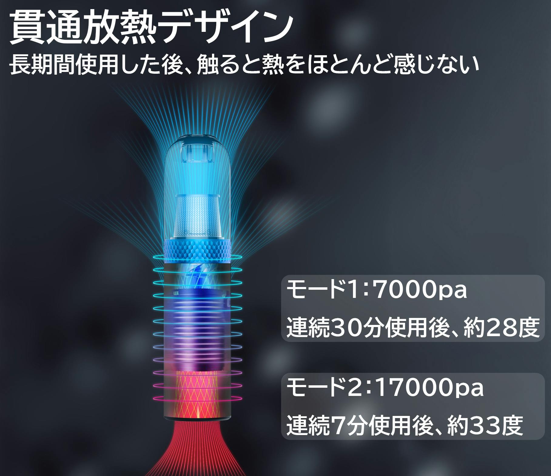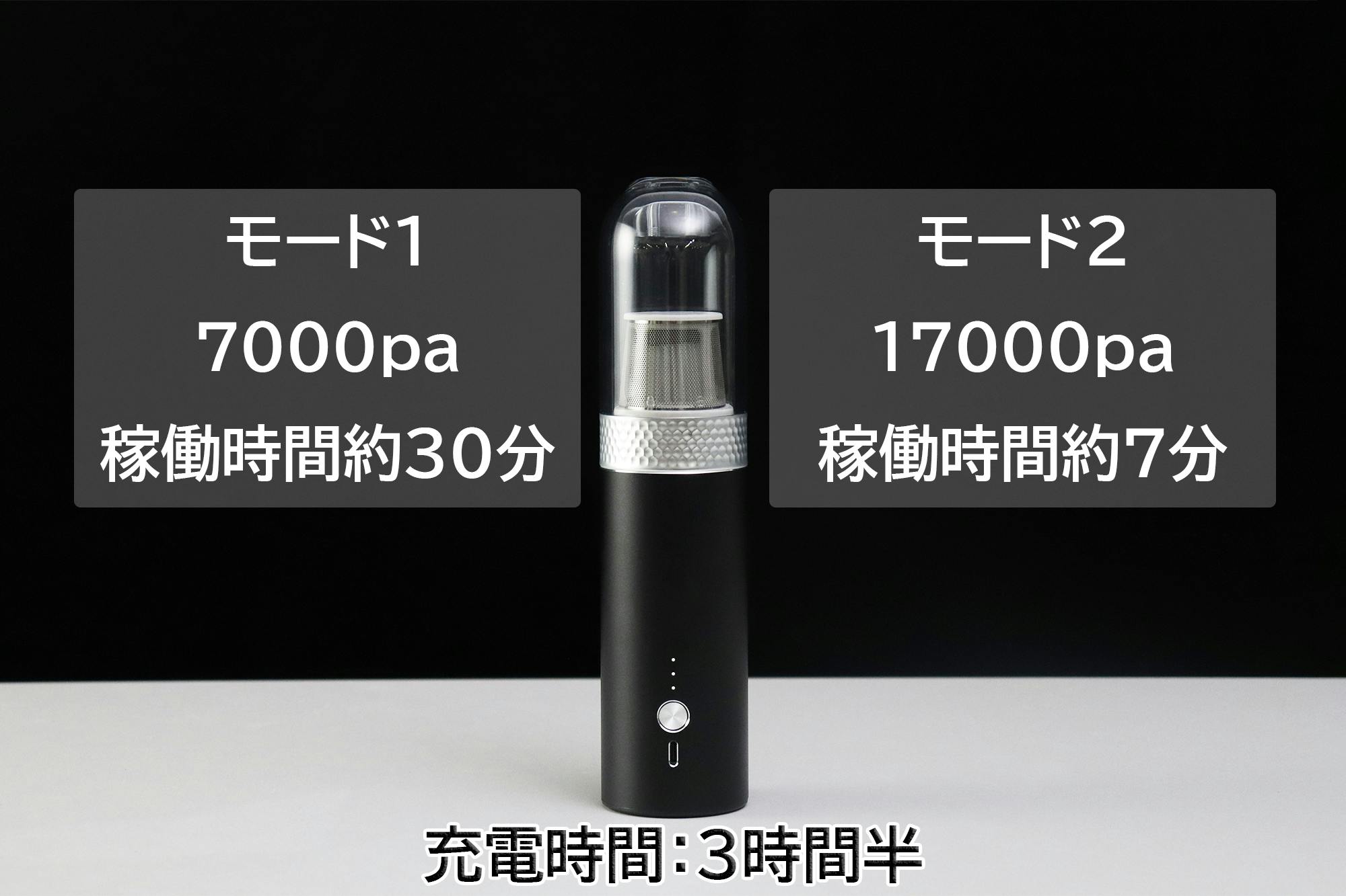 用途に応じて「PASUI」の吸引力にはモード1(7000pa)とモード2(17000pa)の二段階があります。