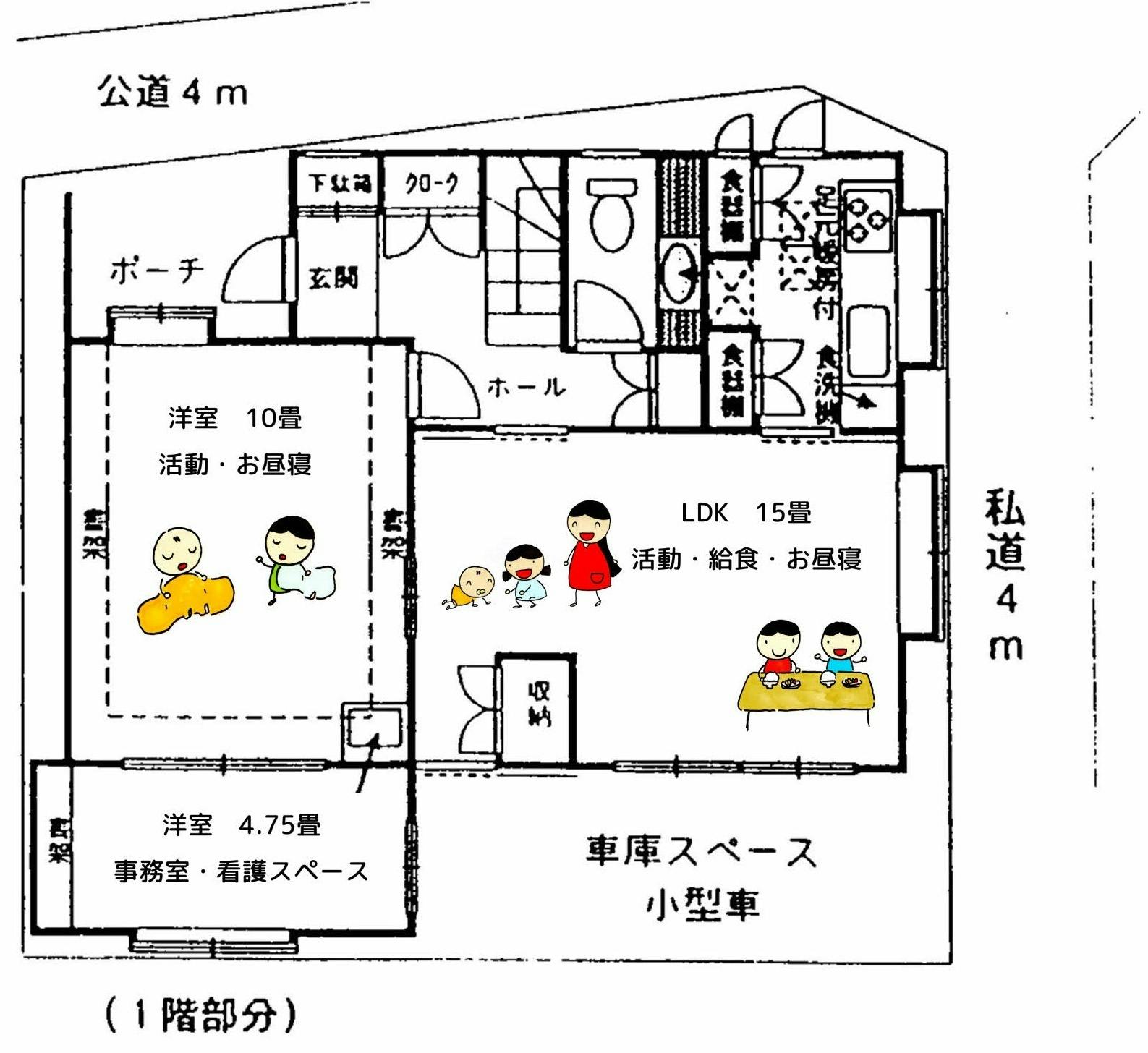 施設のイメージ図(1階)です。1階は小さいお子さんたちのお昼寝部屋や活動部屋となる予定です。また、お昼もこちらでいただきます。2階は大きいお子さんたちの活動部屋となる予定です。