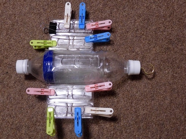 ペットボトルは接着剤がくっつきにくいので、洗濯ばさみをクランプのかわりにして固定中。
