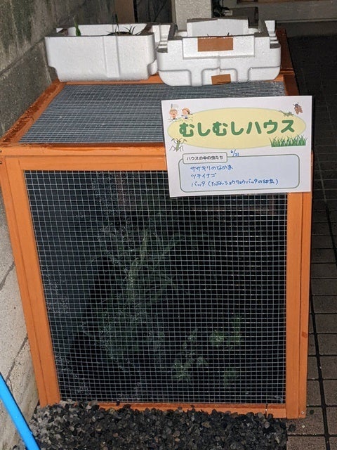 むしむしハウスは、遠目に観ると、タダの小屋です。そんなわけで、「むしむしハウス」とアピールしました。