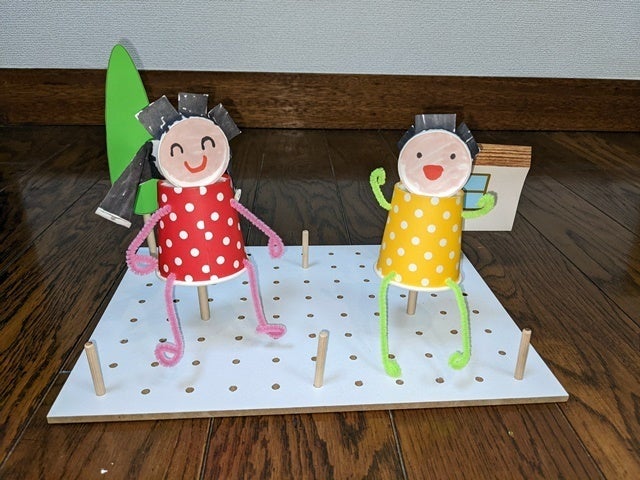 セリアで買ったMDFボードにダボを挿して、紙コップにストローをつけたものを、ダボに挿し込めば人形が立ちます。後ろの木とか家とかも、ストローで立たせているだけ。
