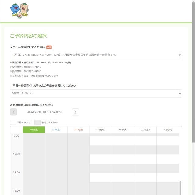 一時保育(Chocotteほいく)のWeb予約ページが一応できました。(もう少し動作確認をするので、まだホームページに組み込んでいません)