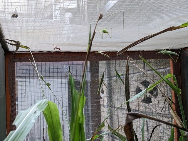 暑くなったので、むしむしハウスに水やりをしました。小屋の上から水をまんべんなくまき散らすので、上に張った網戸の網の部分に水滴がつきます。それを目当てにしてなのか、みんな網に張り付いてきます。この様子がなかなかおもしろいです。