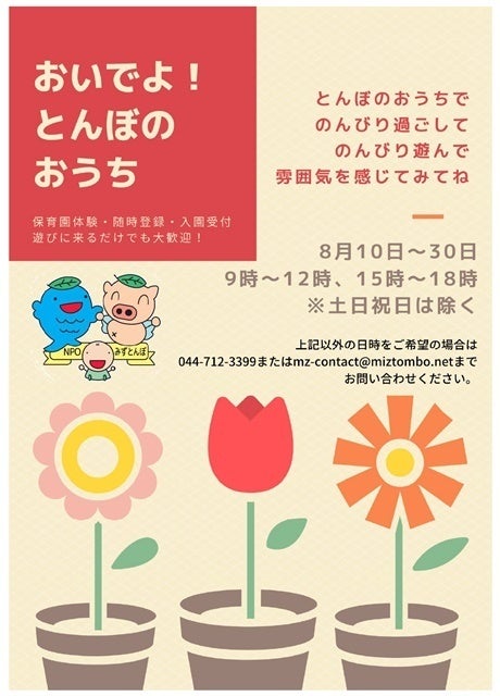 さて、8月10日から「おいでよ!とんぼのおうち」ということで、9時~12時、15時~18時の間、開放しています。それとあわせて、随時利用の説明や入園受付を行っています。