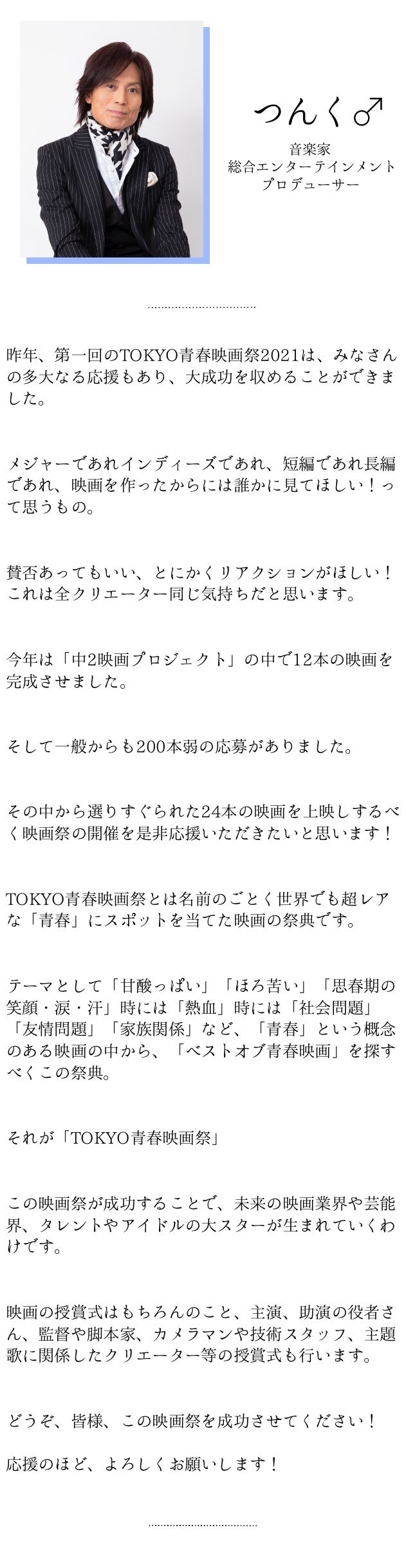 「TOKYO青春映画祭」はエンタメプロデューサーつんく♂が自身のサロン内で「中2に見えるヒロイン募集」からスタートし、「中2」が主人公の「中2映画」を制作することから発展した映画祭です。