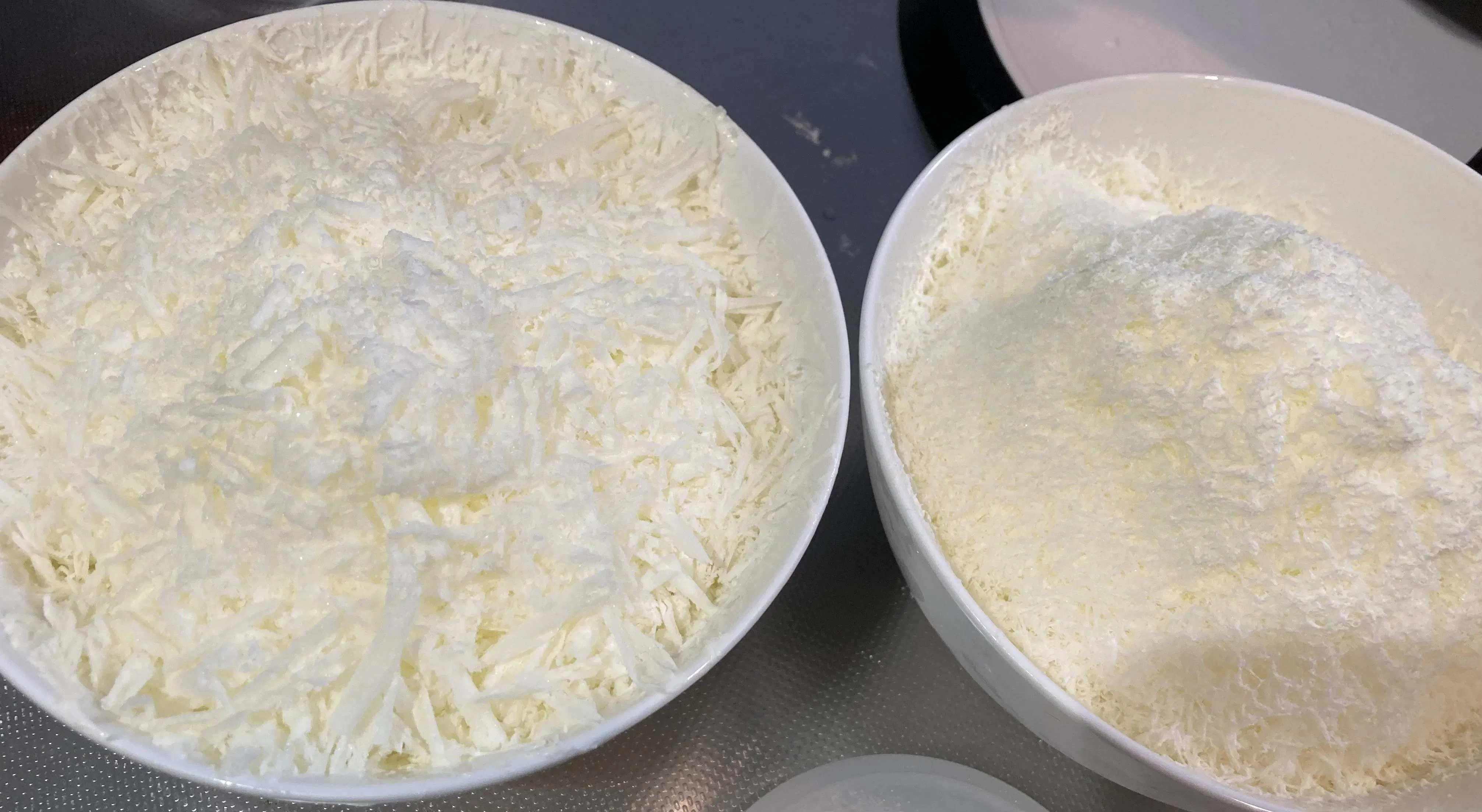 また、右側の方は細かく空気を含んで削られているため、とてもフワフワな食感で口に入れた瞬間に溶けてなくなるような舌触りになります。