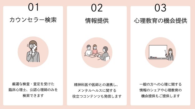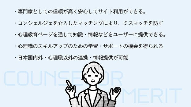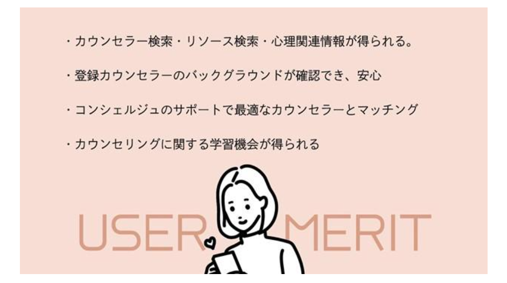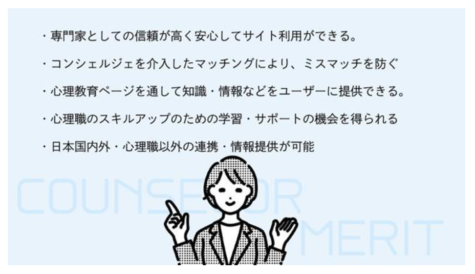 より的確に相談者の状況判断を行い、それをサポートできるカウンセラーとマッチングができ、かつカウンセリングを始める前の悩みや疑問に対してもサポートしてくれる機能があることで、通常の個人によるカウンセラー検索機能に加え、自分や症状により適したカウンセラーと出会えるように第三者サポートを受けることが可能になります。