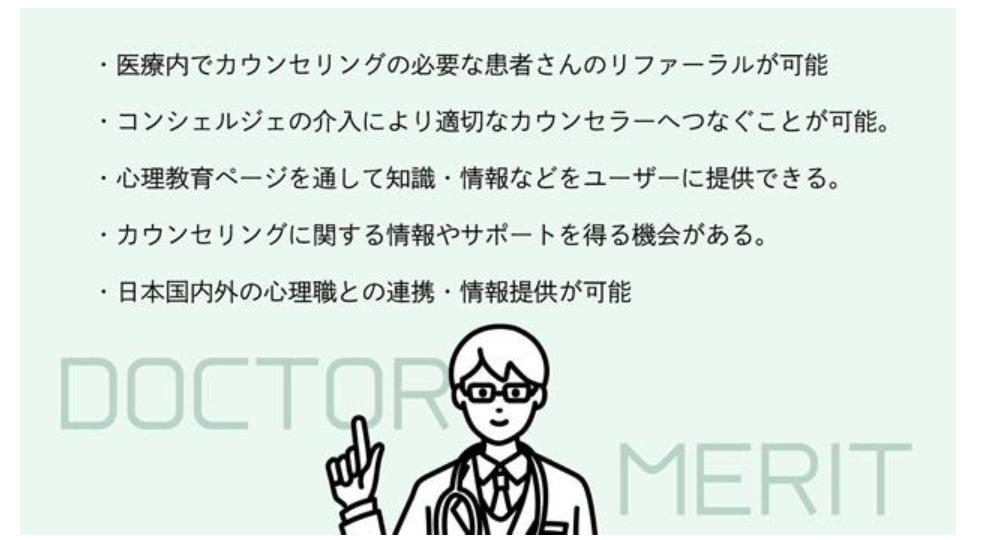 また医師や医療機関の方が、患者さんへのカウンセリング先をお探しの場合、、このコンシェルジェが医療機関の方とのコミュニケーションをとることで、より適格に安心をしてカウンセラーへの紹介が可能になります。