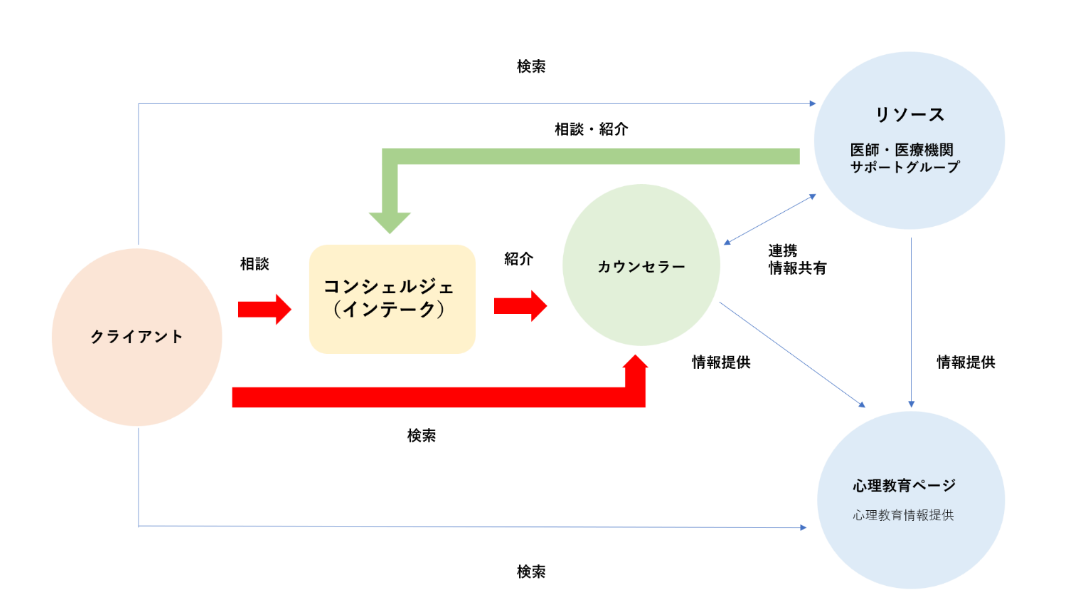 Also, when seeking counseling, many clients are worried about "I don't know who to ask for counseling" or "It is difficult to decide whether I should really see counseling". In order to solve those concerns, we will introduce a function called “concierge (intake)” managed by individuals who have has received professional training.