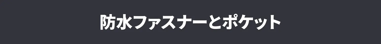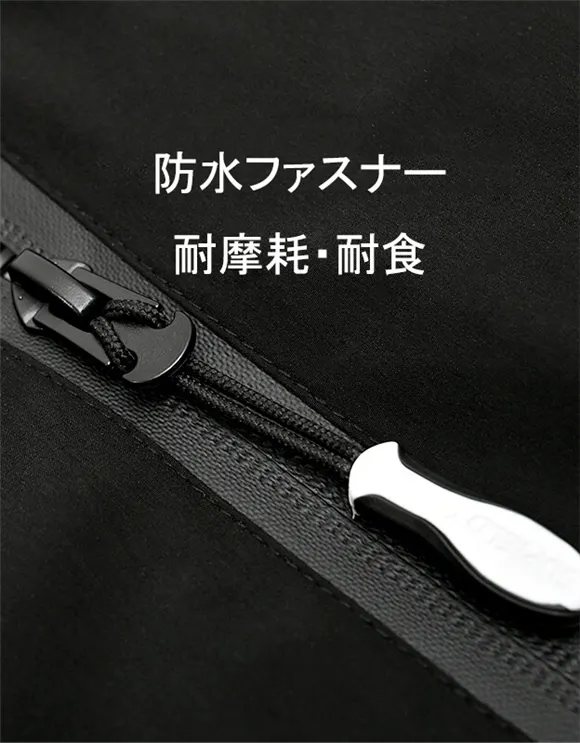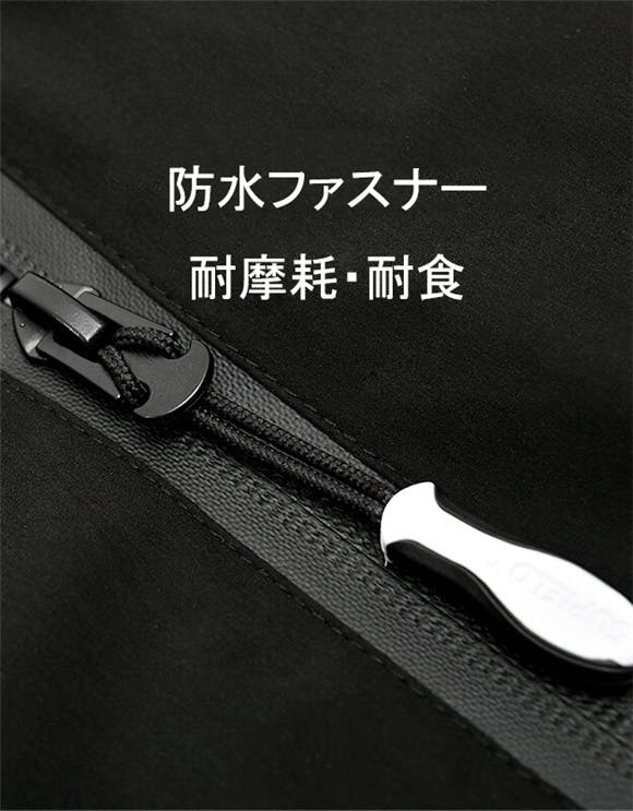 センターファスナーをはじめ、外側にあるすべてのファスナーに防水タイプを採用。 ファスナー部からの水侵入を防ぎます。