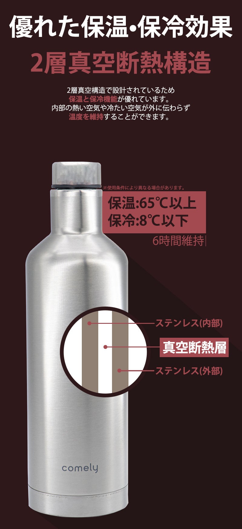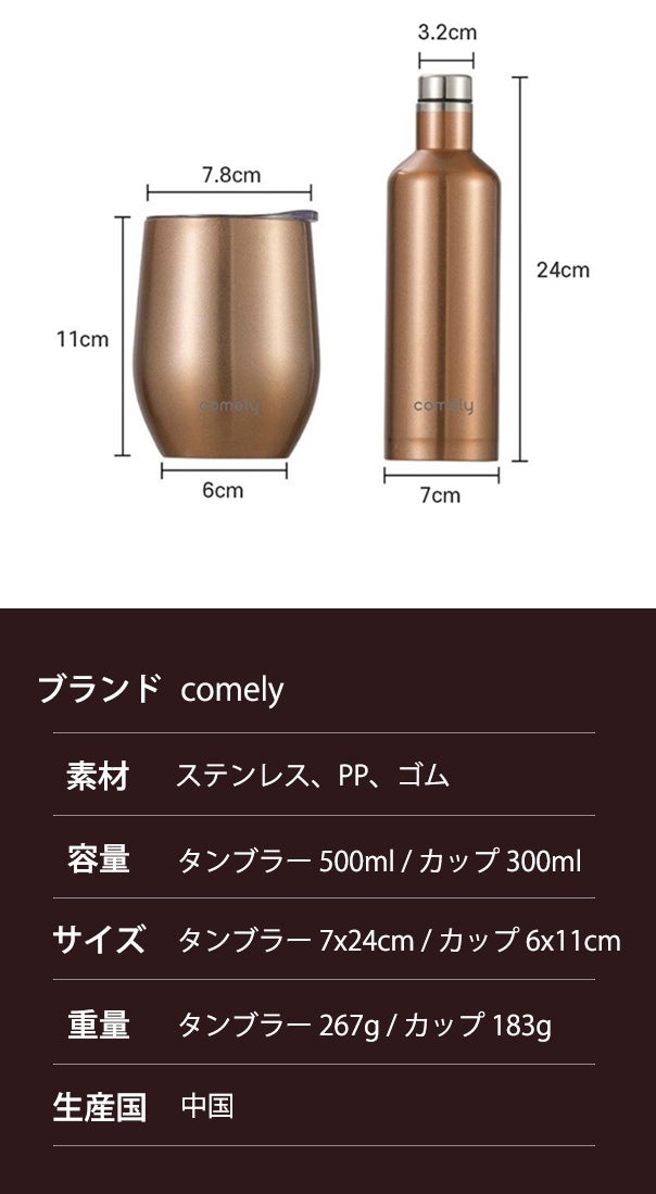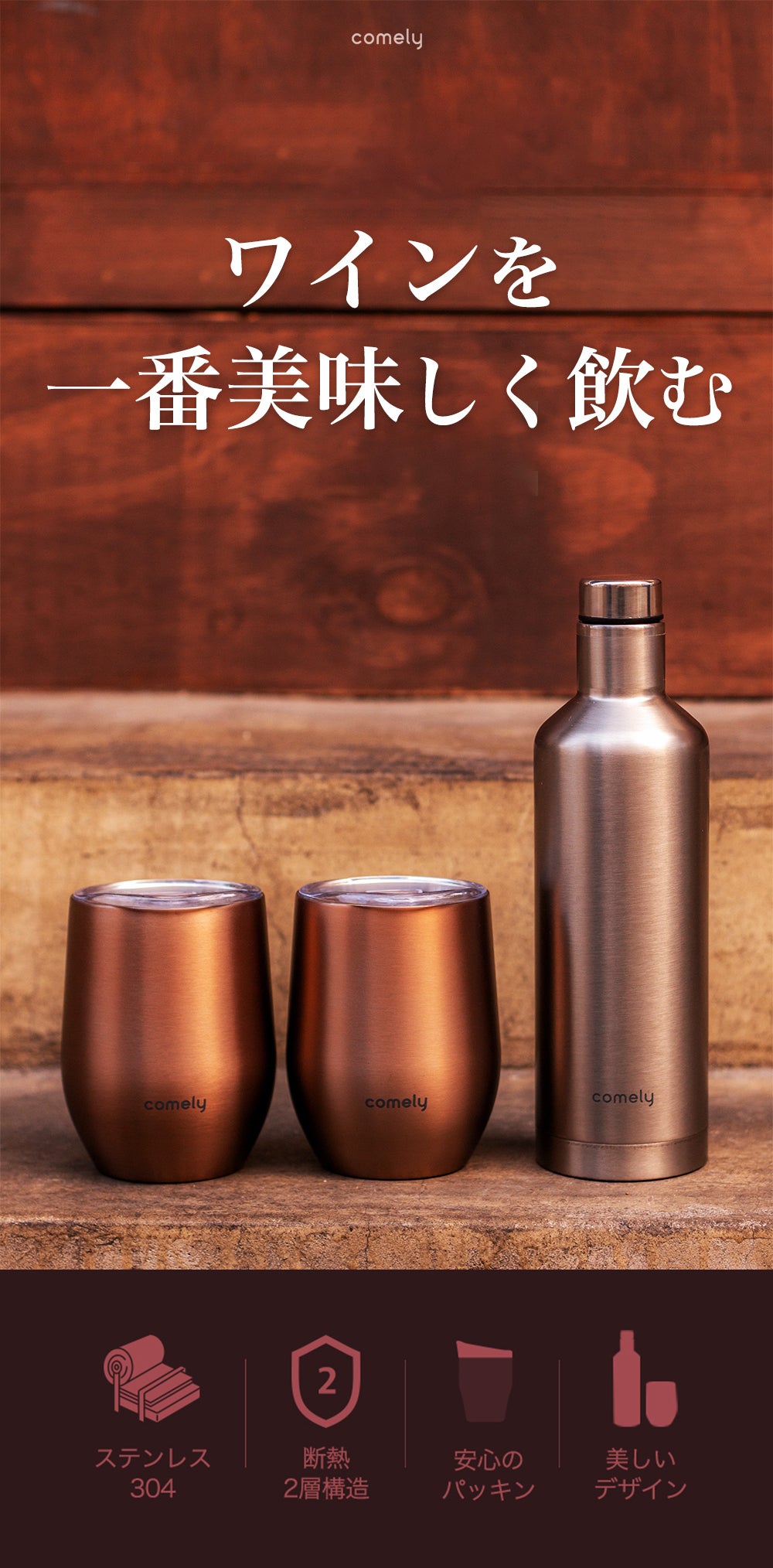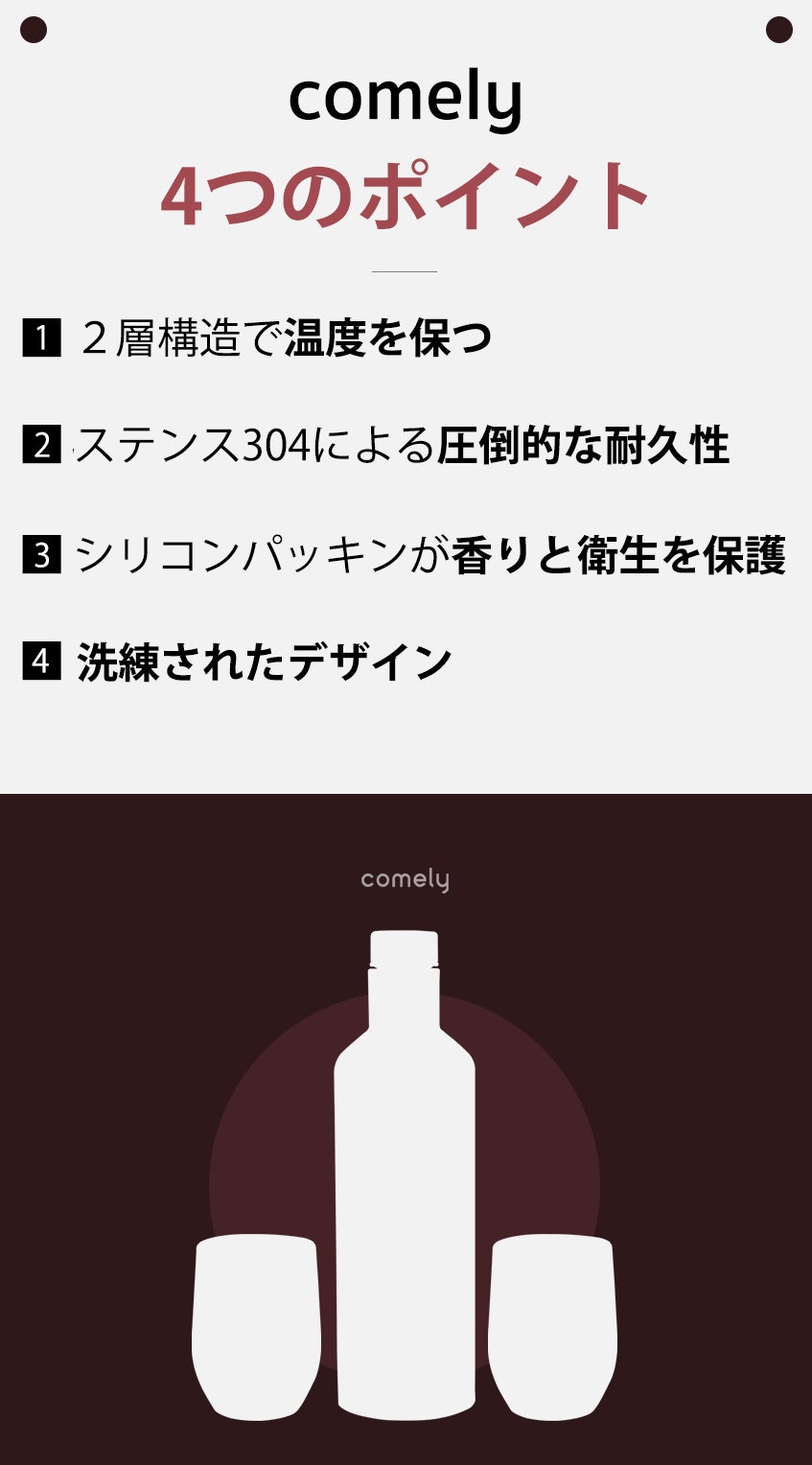 comelyはステンレスの2層真空断熱構造で設計されているため、中のお酒、飲料の温度を長時間維持し、お酒の味と香を保ちます。