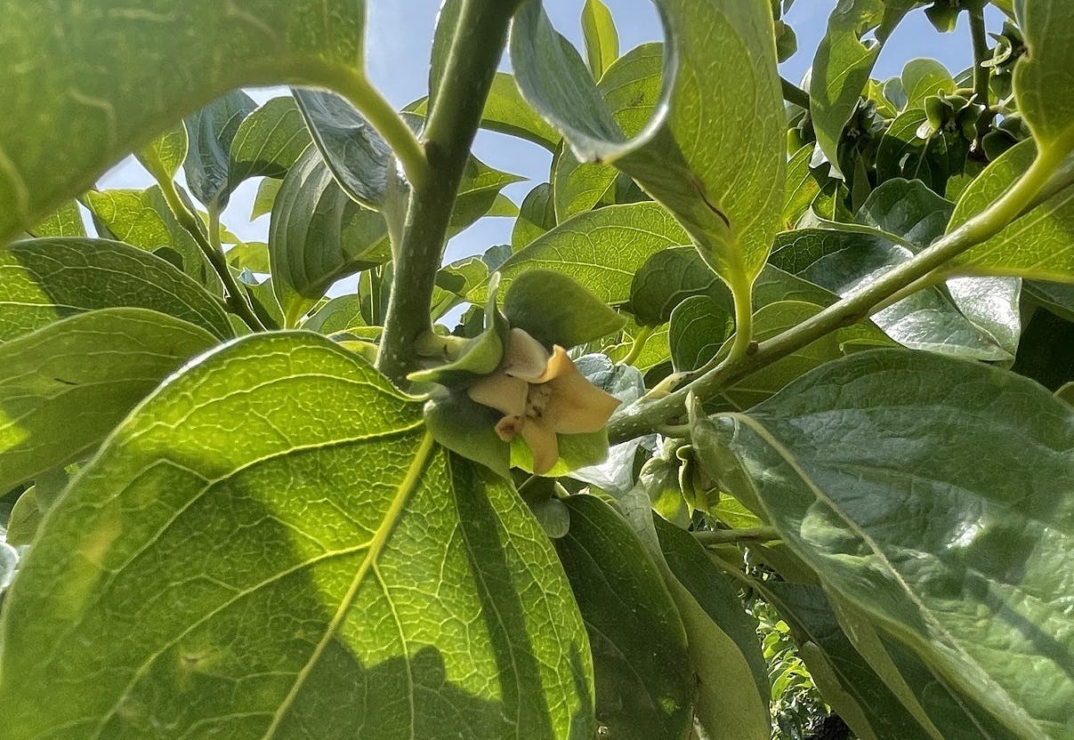 花の中の実が、そう、秋にオレンジ色になるあの柿です。農家さんの指と比較すると、どれだけ小さい実かわかっていただけると思います。