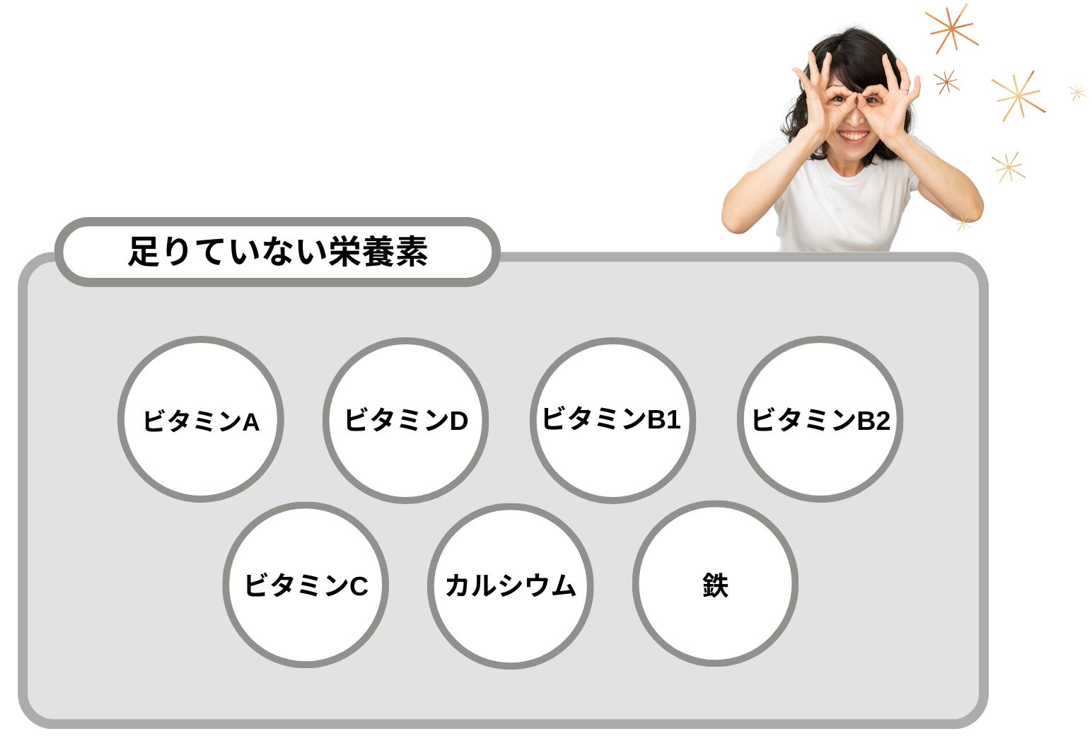 そこで、毎日手軽にしっかりと不足分の栄養を補えるように、原材料だけでは足りないビタミン・カルシウム・鉄を機能性食品原料に頼ることにしました。日本だけでなく、海外でも食品に使用されているかを厳格に確認したものだけを使用していますので、安心して召し上がっていただけます。