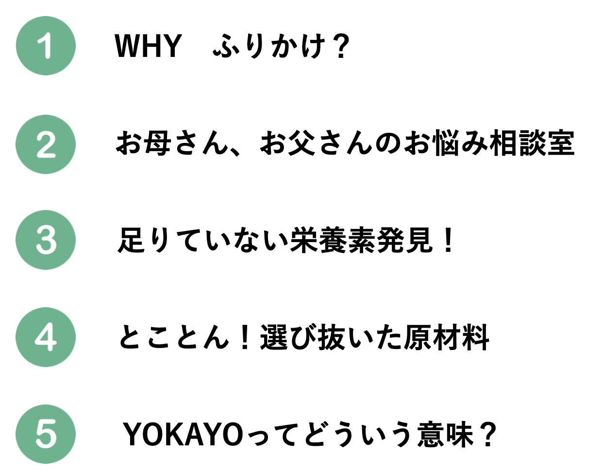 そこで、YOKAYOのふりかけでは、栄養サポート食品として、これらの不足している栄養素をしっかりサポートできる商品づくりに乗り出しました!