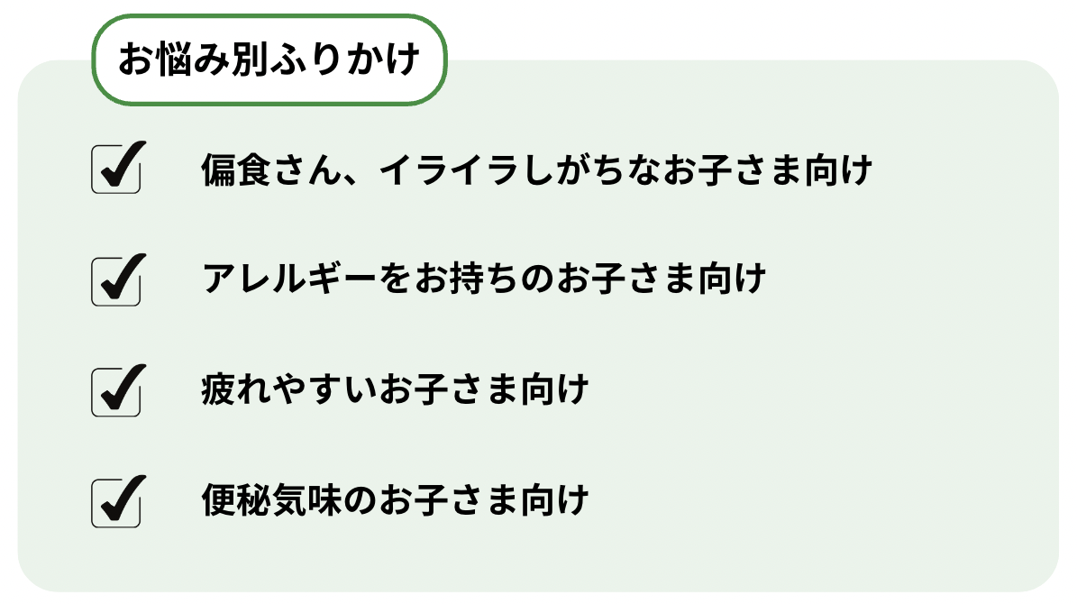 ご飯にパパっとかけるだけで子どもたちが必要とする栄養をしっかりサポートできる、みんなが大好きな“ふりかけ”。