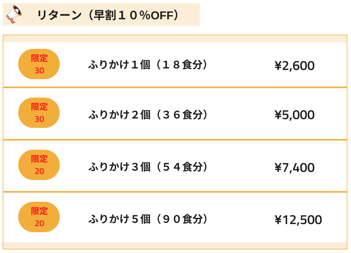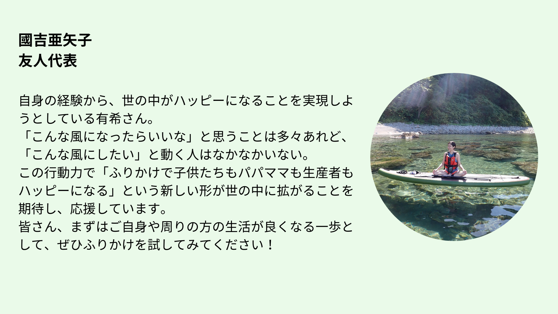 この1作目をより多くの方にお届けできることが、皆様に信頼いただけている証となり、他3種類のふりかけの製造、容器開発のための資金調達のためにも、とても重要になります。