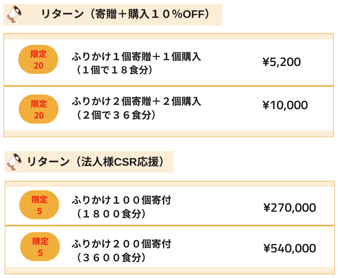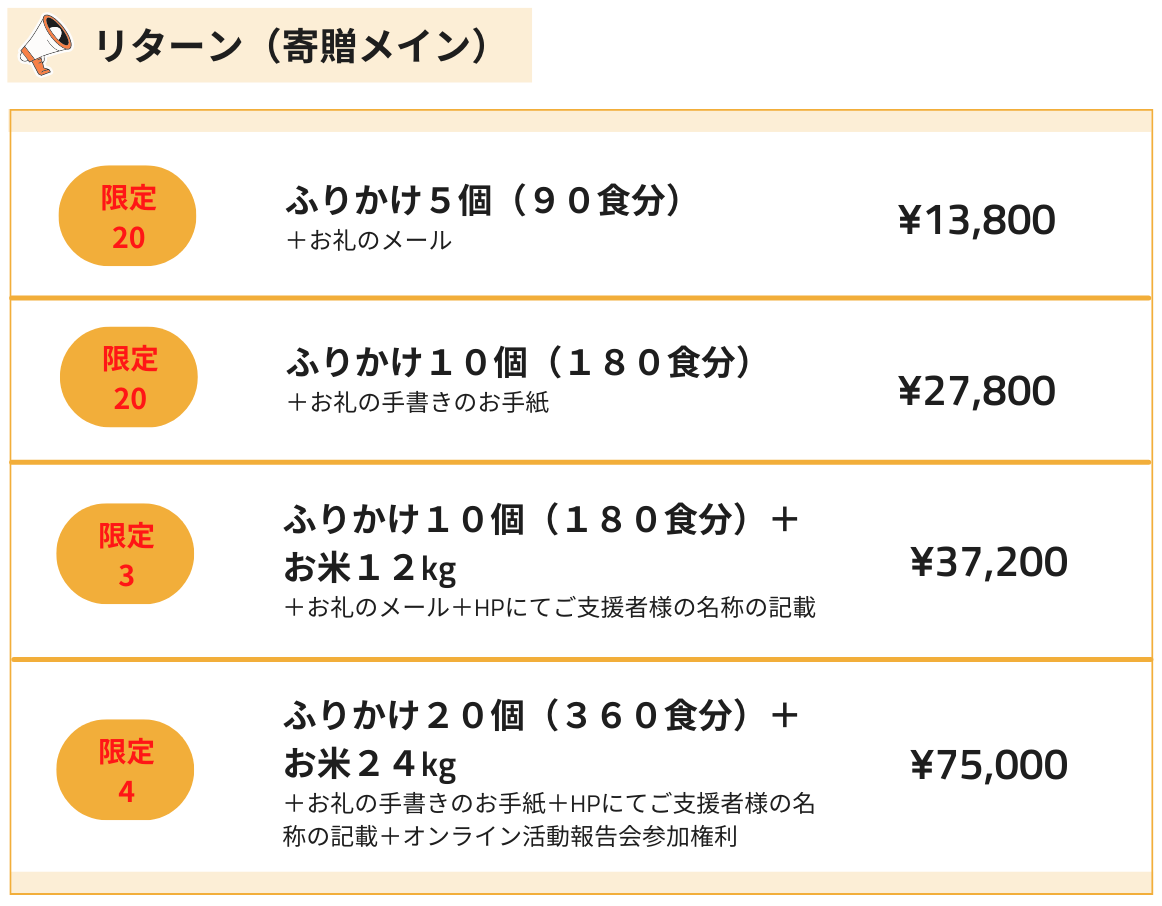 食事に困る子どもたちの応援するため、今回のリターンに「寄贈」を含めることにしました。