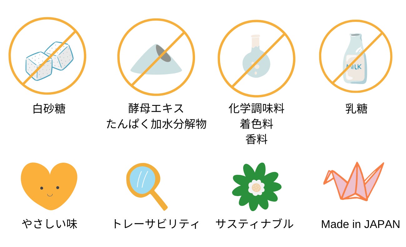 昨今、デリケートな問題にもなっている原産地、加工地。YOKAYOは安心してお母さん・お父さんに手に取っていただける商品作りのために、原材料の原産地、加工地にも徹底的にこだわり、可能な限り原産地・加工地共に日本のものを揃えています。また、原材料の企業さま・生産者さまの人権や環境に対する意識も把握した上、セレクトしています!
