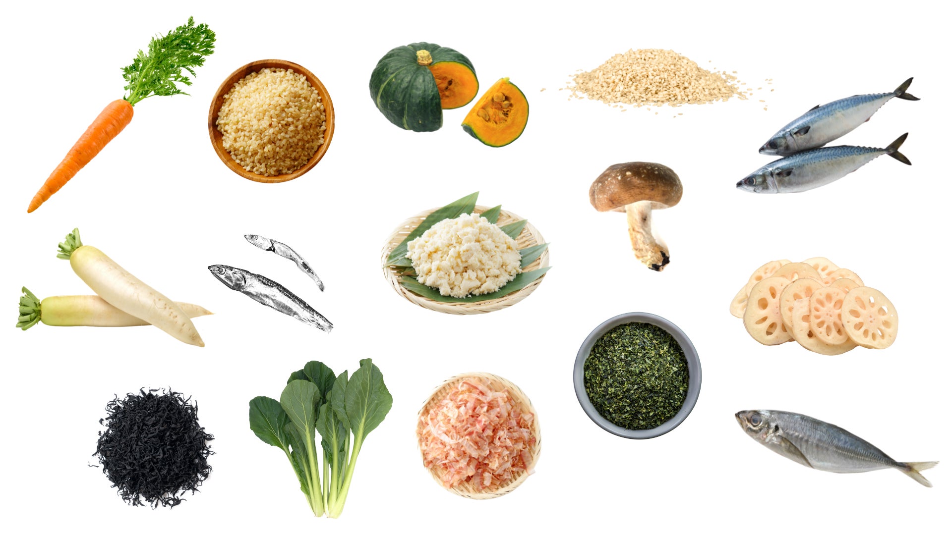 原材料名:発芽玄米フレーク、ごま、食塩、おからパウダー、煮干し粉末、干し椎茸、大根粉末、かぼちゃ粉末、鰹節、鯵粉末、鯖粉末、れんこん粉末、甜菜糖、小松菜粉末、ひじき粉末、海苔、にんじん粉末/ヘム鉄、ビタミン類、貝カルシウム(予定。一部変更の可能性あり。)
