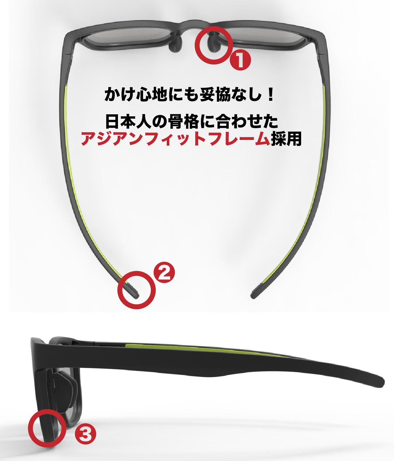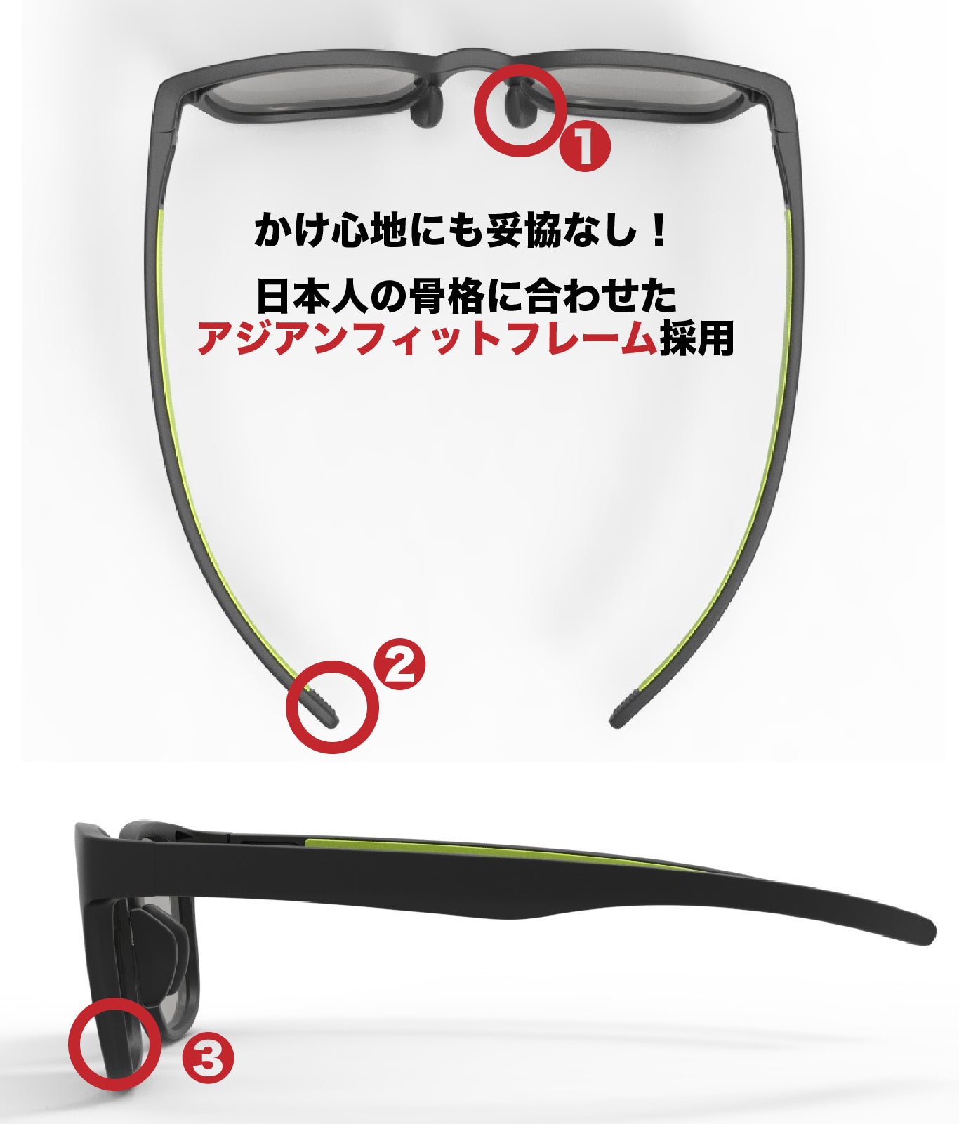 ③ 日本人の顔に適したフレームが、頬にあたりづらい角度。
