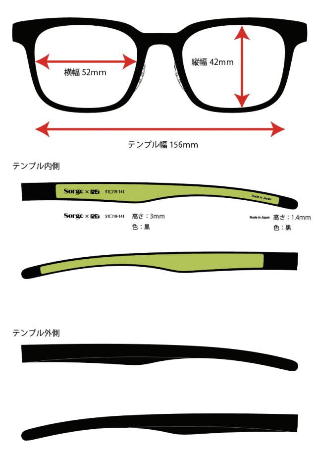 ・レンズ横幅:(片側最長)52㎜・レンズ縦幅:(最長)42㎜・テンプル幅:156㎜