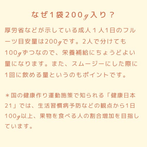 フルーツの味と栄養をきちんと体に届けることができます。1種類だと味のバランスが悪い、4種類以上だと風味が複雑すぎてしまったり、1種類の重量が減ることで貴重な栄養素の必要量を満たせないという課題が生じてきます。