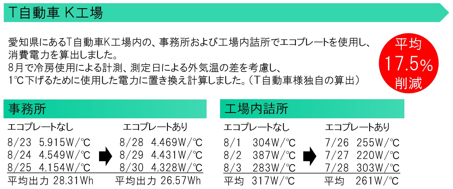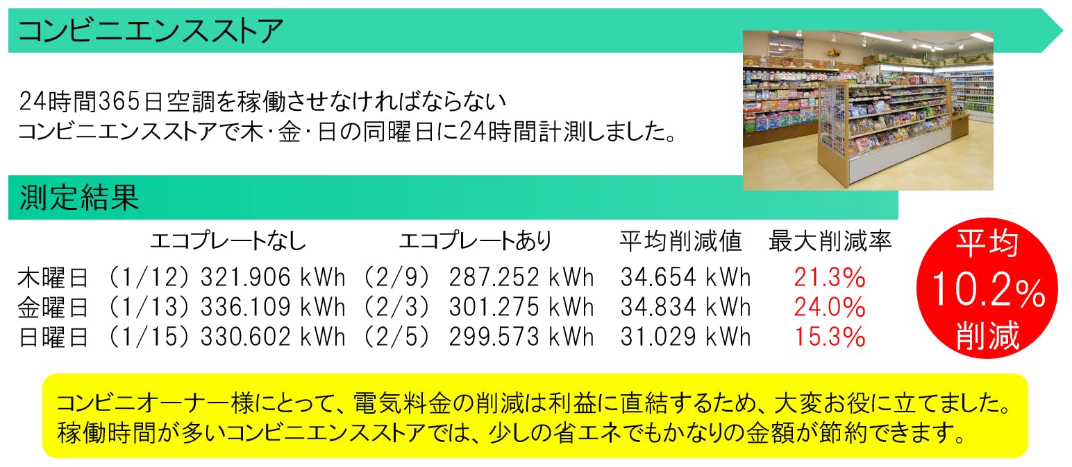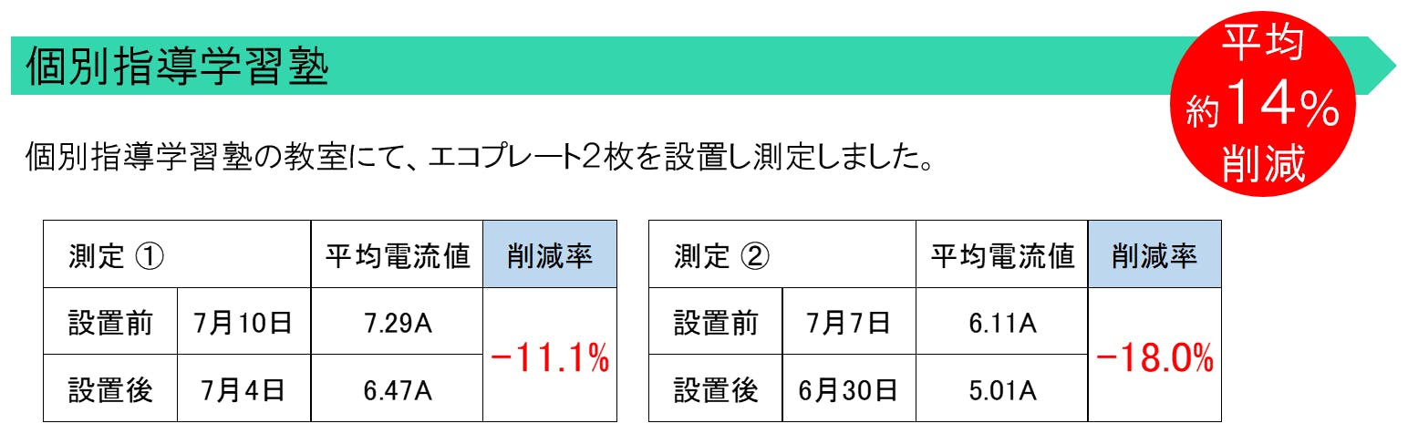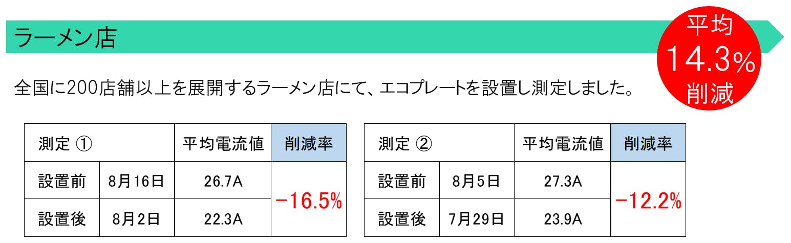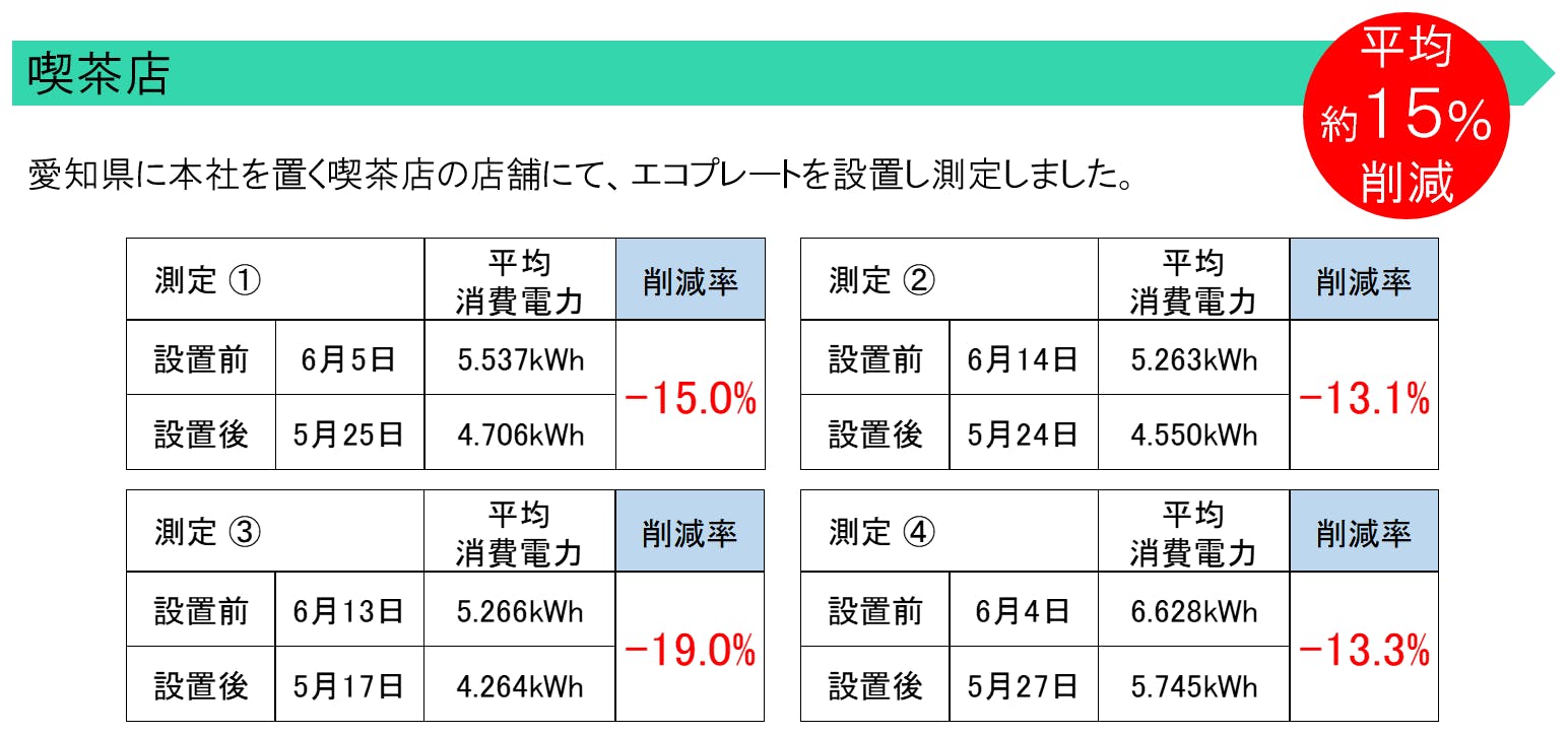 いくつかの企業様において、「エコプレート」設置前と設置後の消費電力の違いを測定をさせていただきました。