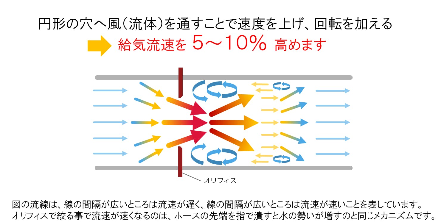 この仕組みを利用し、空気を円形口を通して取り込むことで給気速度を5~10%アップさせています。