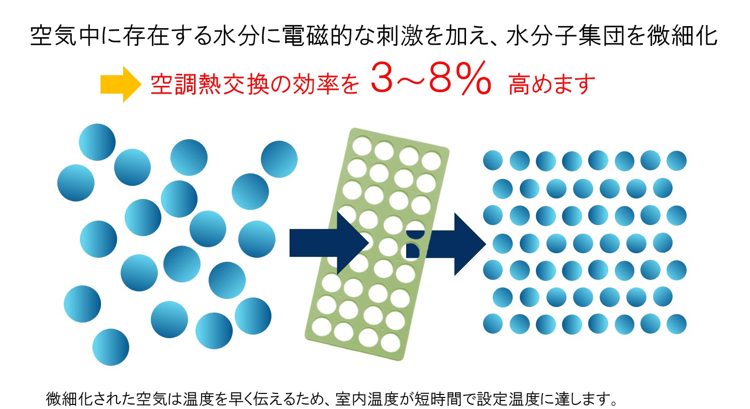 セラミックがもつ電磁的な特性を利用してエコプレート周辺空間に電場を発生させ、そこを通る空気中の水分子を電気的に細かく整列させることにより、空調熱交換率を3~8%高めています。