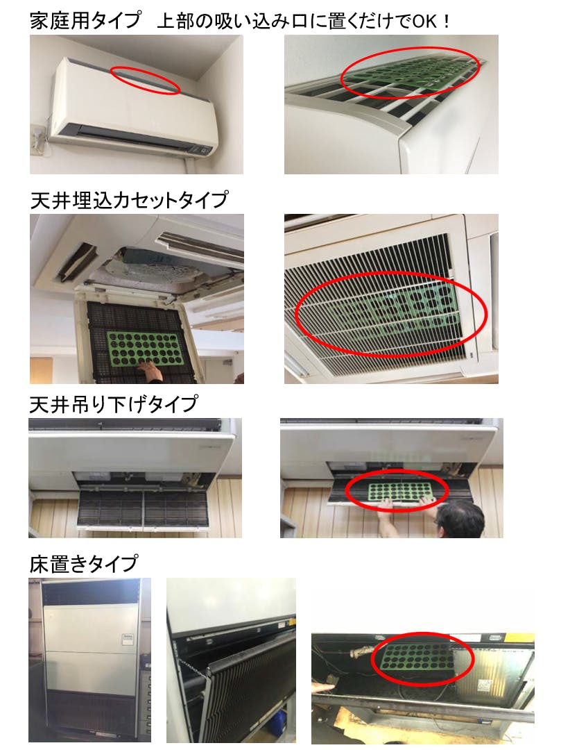 設置方法はとてもシンプル、吸気口に載せるだけ!ご家庭のエアコンから職場、店舗、工場などエアコンのタイプを選びません。