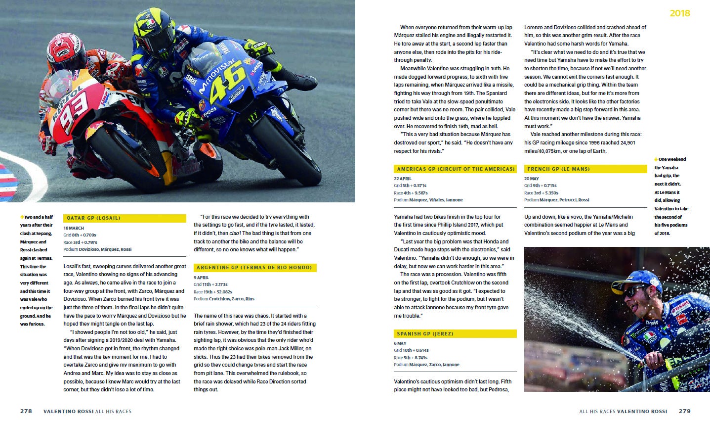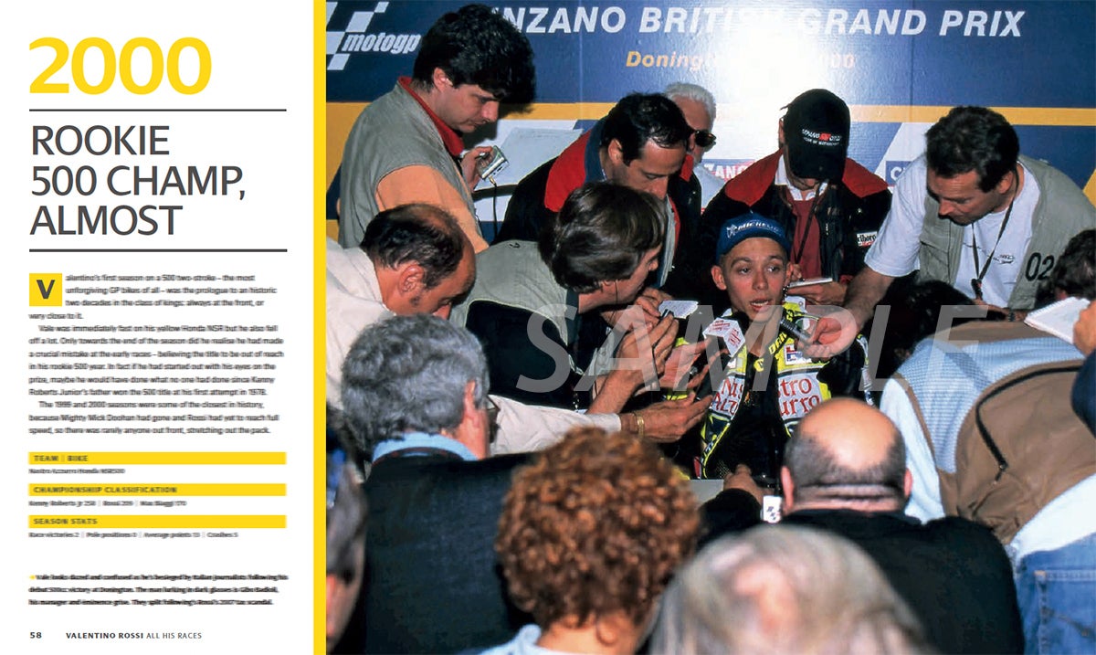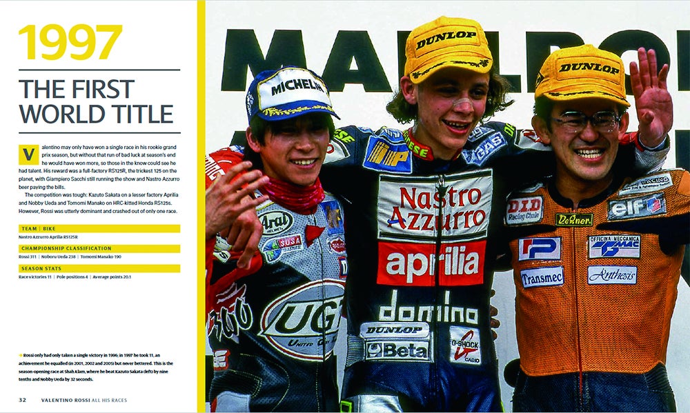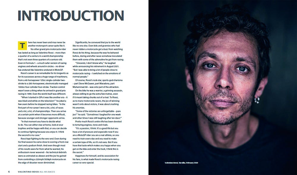タイトルの「ALL HIS RACES/オール・ヒズ・レース」が示すように、これはバレンティーノ・ロッシの幼少時代からイタリアの地方選手権、そして世界グランプリへの参戦から最高峰に登り詰め、引退するまでが網羅され、まさにロッシの百科事典とも呼べるべき豪華フォトブックです。